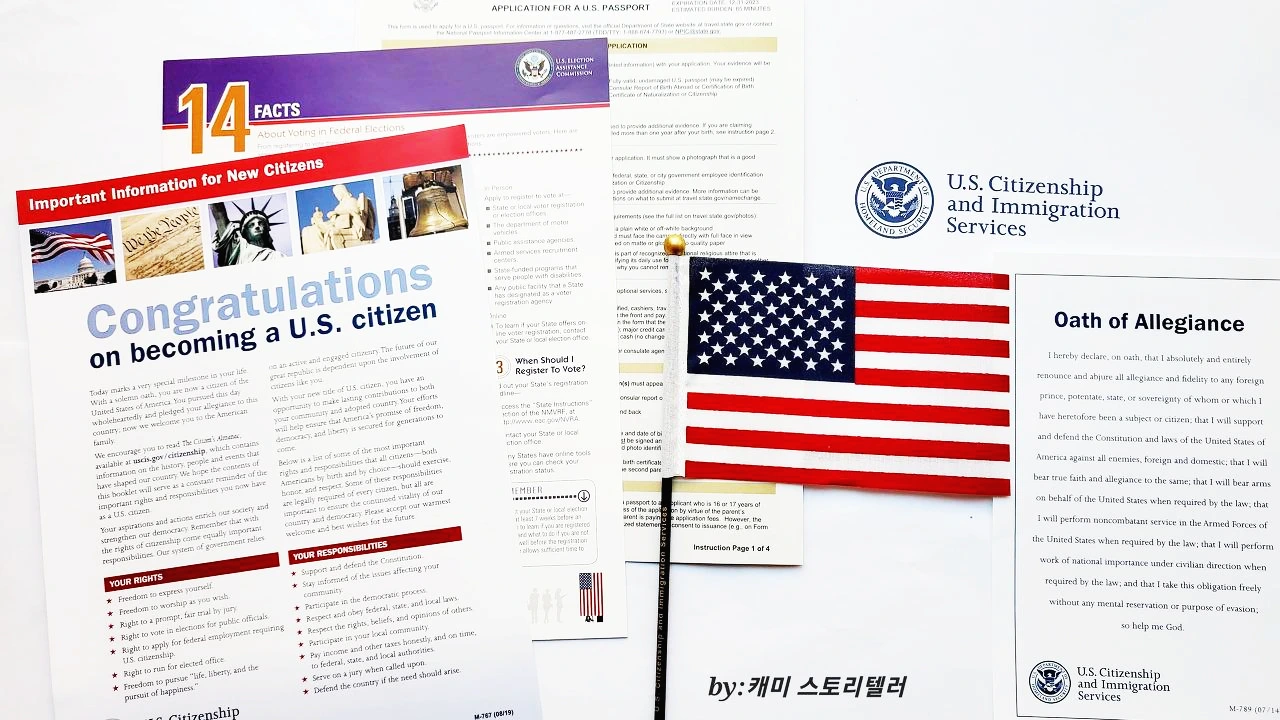 얼마 후, 시민권 증서를 손에 든 직원이 와 사람들과 함께 나란히 서서 충성 선서를 따라 읽고 시민권 증서를 받아 퇴장. 건물을 나오면서 만난 보안요원들도 웃으며 축하의 말을 전했다.