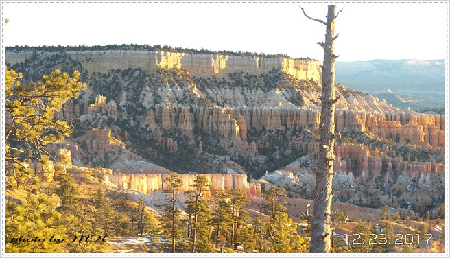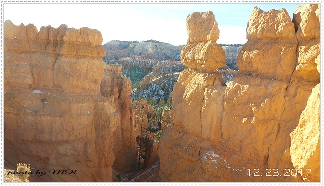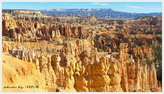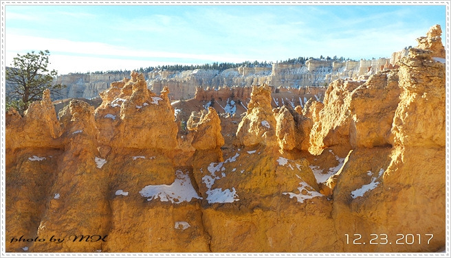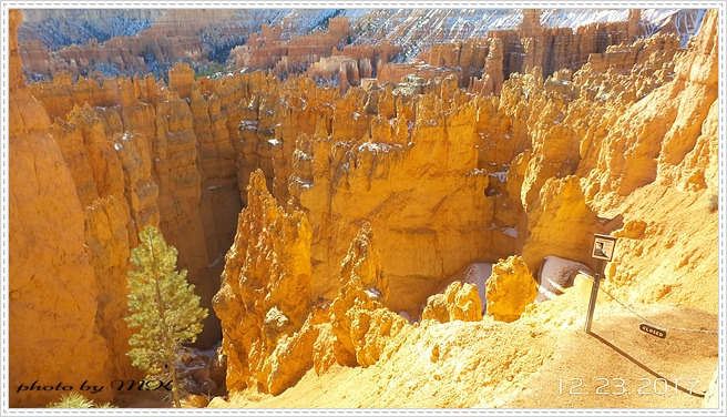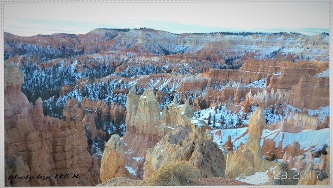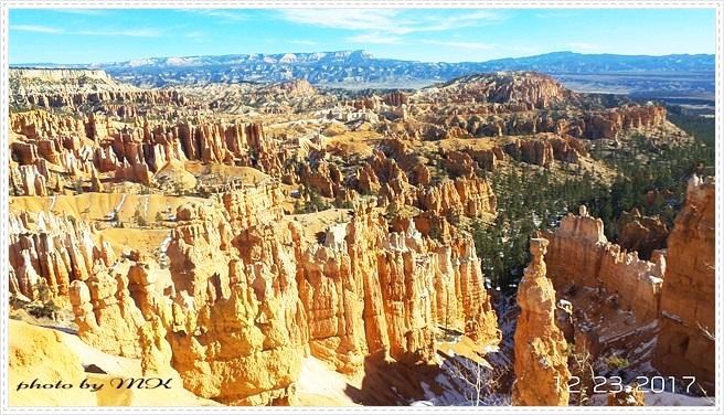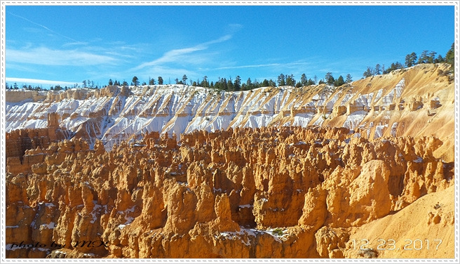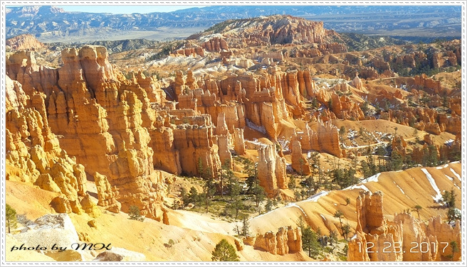 브라이스 캐년은 위로 올라가는 곳이 아니라 관광객이 위에서 아래로 내려보는 캐년으로서 붉은색의 황토가 드넓게 펼쳐지며 만들어낸 아름답고 특별한 경관에 처음 보는 순간 숨이 멋을 정도이다.