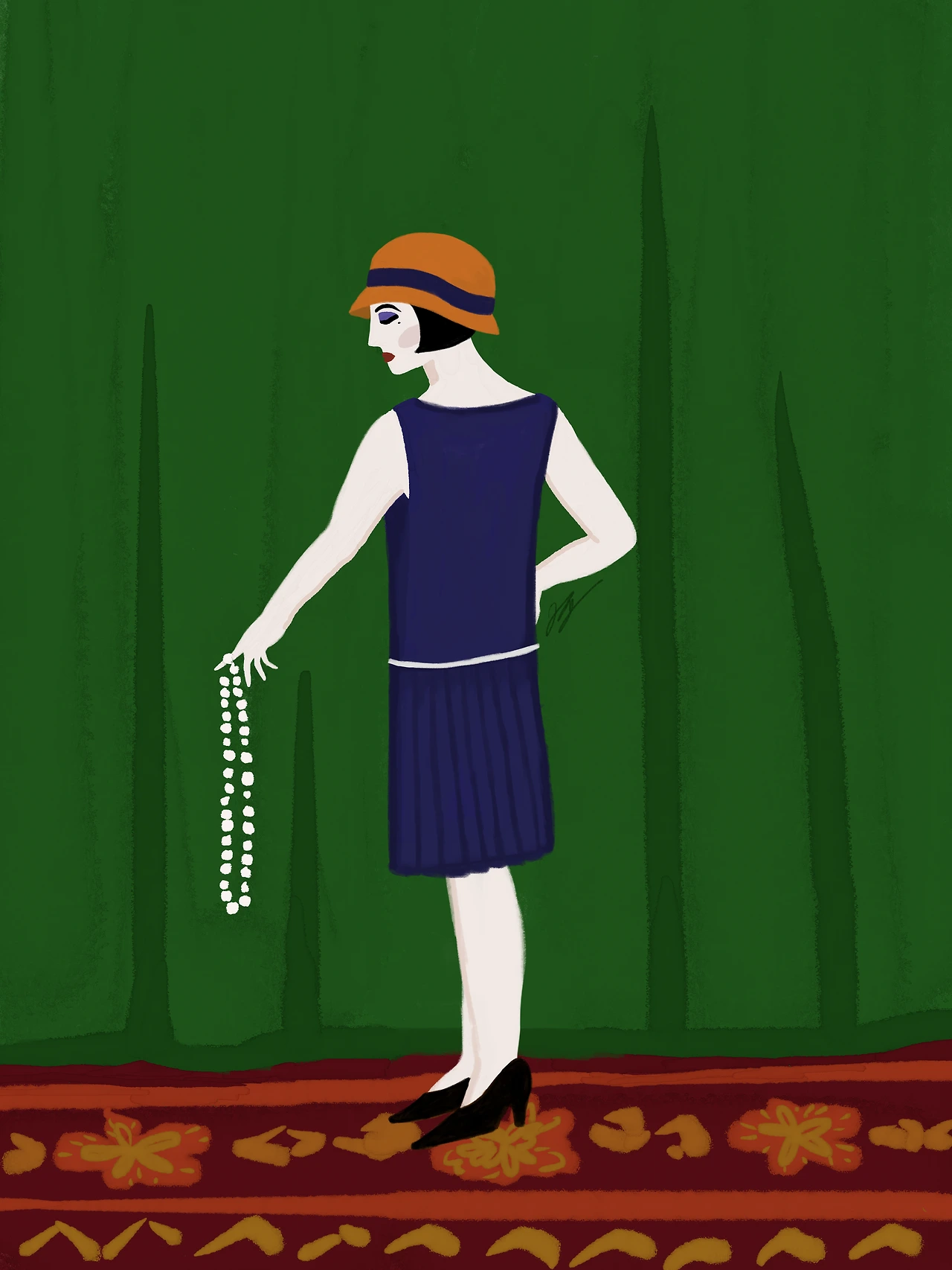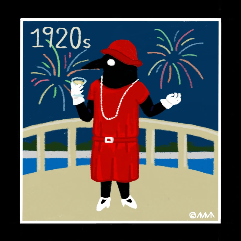 머리 길이 역시 줄어들어서, 여성미의 정석이었던 긴 머리에서 벗어나 짧고 구불구불한 핑거 웨이브와 보브 헤어가 유행했습니다. 모자 역시 챙이 넓지 않고 두상 전체를 자연스럽게 감싸는 클로슈 햇(cloche hat)을 많이 썼고요. 한편 머리 길이가 짧아지고 옷이 단순해지니, 파티에 참석할 때는 화려한 머리띠나 터번을 쓰고, 강렬한 색감의 모조 보석을 착용하게 되었습니다. 또한 다리가 노출되는 만큼 신발과 스타킹이 패션에서 중요한 위치를 차지하게 되어서, 실크 스타킹이 유행했고 신발은 검은색 펌프스를 주로 신었습니다.