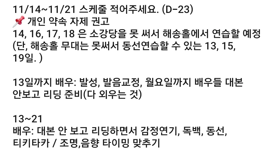 습작 연출에 배우 7명과 조명, 음향까지 다 채운 걸 보면 인원에 대한 걱정은 덜었을 뿐만 아니라 배우들과 으쌰으쌰 올릴 수 있었던 추억이 3월 연극 참여할 수 있었던 계기가 된다. 이 극을 창작할 시간까지 3일 꼬박 걸렸고 돌아간다면, 촉박하게 극을 쓰지는 않았겠지만 얼추 시놉시스, 로그라인의 형식적 내용을 갖춘 것도 보면 전공 수업에서 학점을 챙기기보단 '내가 챙길 수 있는 것이 무엇일까?'를 생각해 볼 수 있었던 좋은 시간이었다.