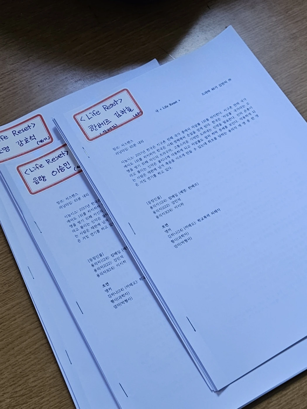 극 <Life Reset > 은 내가 2학기 전공 수업인 '영상문학론'에서 기말고사를 잘 보기 위해 혼자 실습했던 희곡이었다. 영상문학론은 시나리오의 전반적인 학습과 실습을 하는 전공 수업이다. 실습은 조별로 하나의 중심 장면의 시나리오를 적는 것이었지만 나 혼자의 자기 계발 시간도 필요했다. 연극 동아리니까 나중에 연극을 올릴 때 이걸로 해봐야겠다는 마음도 적지 않게 있었다.