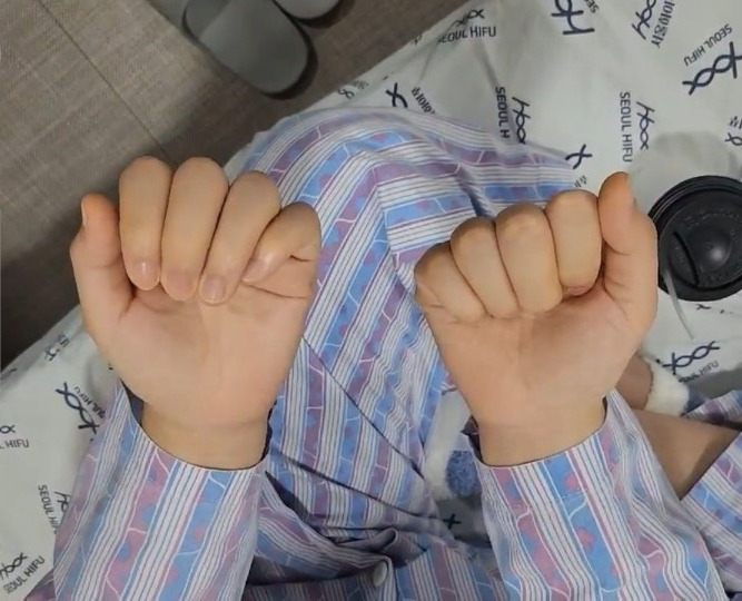 전날 저녁에 간호사 선생님께서 수액을 4리터 이상 맞았으니 퉁퉁 부울 거라고 놀라지 말라고 예고해 주셨음에도 아침에 퉁퉁 부은 내 모습을 본 언니는 소스라치게 놀랐다. 얼굴은 선풍기아줌마처럼 아주 빵빵하게 부어서 팔자주름뿐 아니라 어릴 때부터 있던 눈가주름까지 몽땅 사라진 상태였고 손이 부었는데 그중 수액을 맞은 왼손이 오른손보다 더 부어서는 주먹이 쥐어지질 않았다.