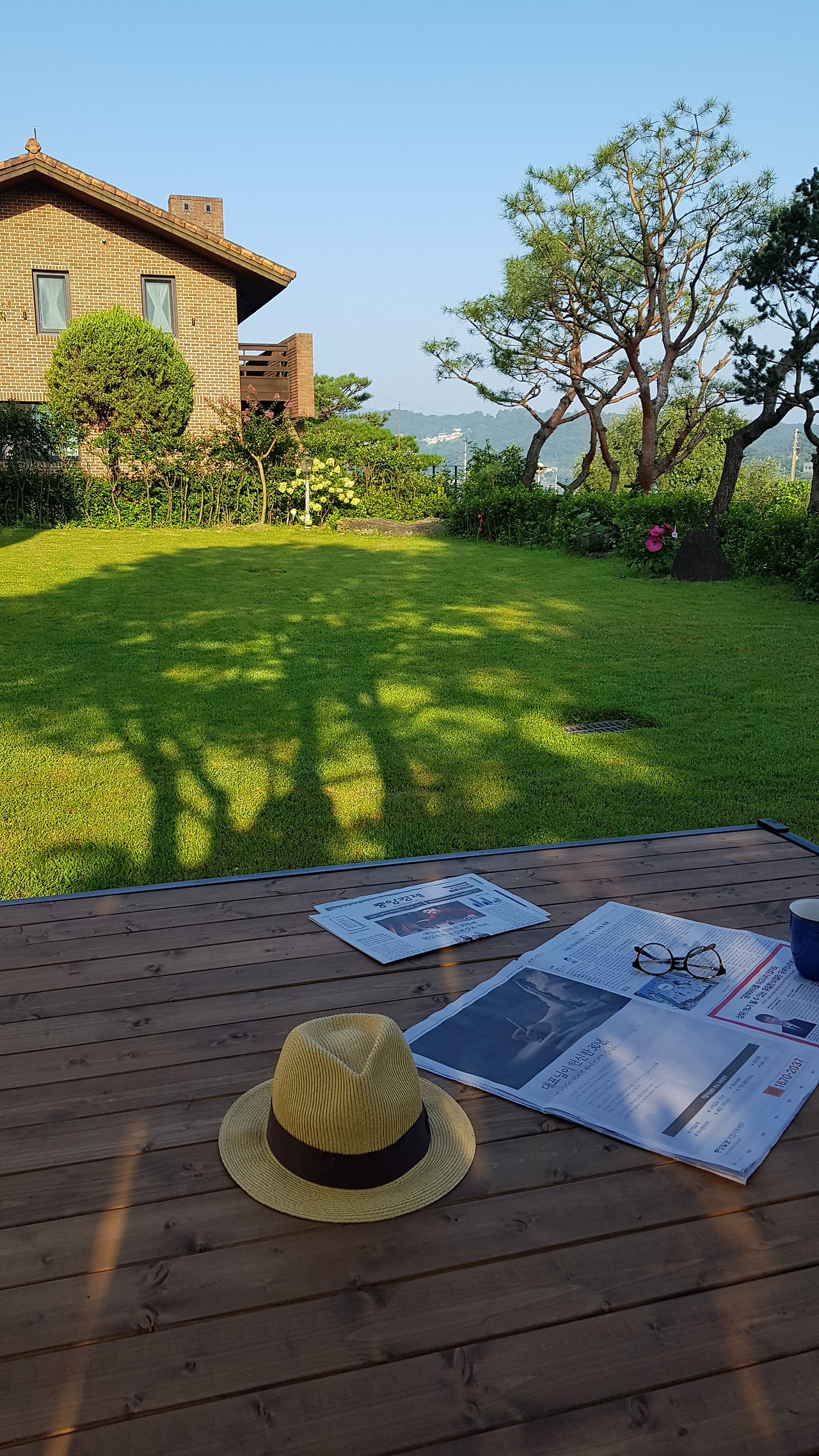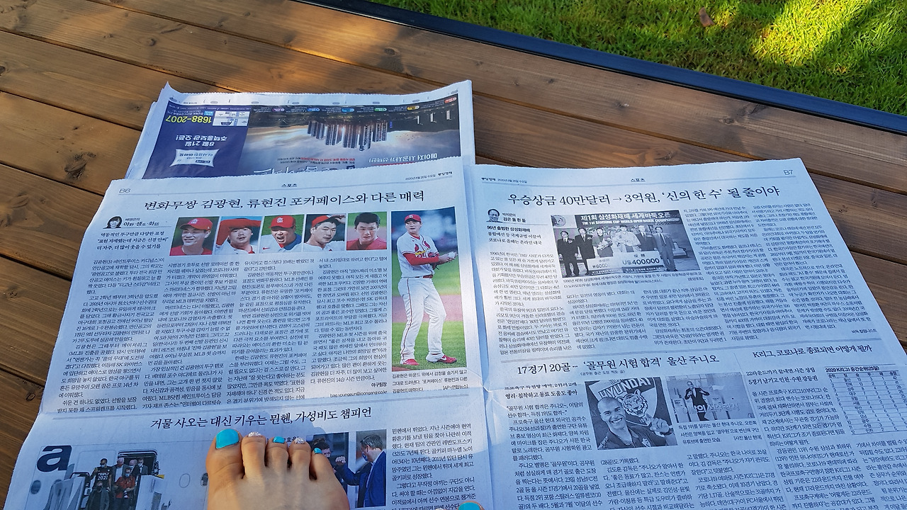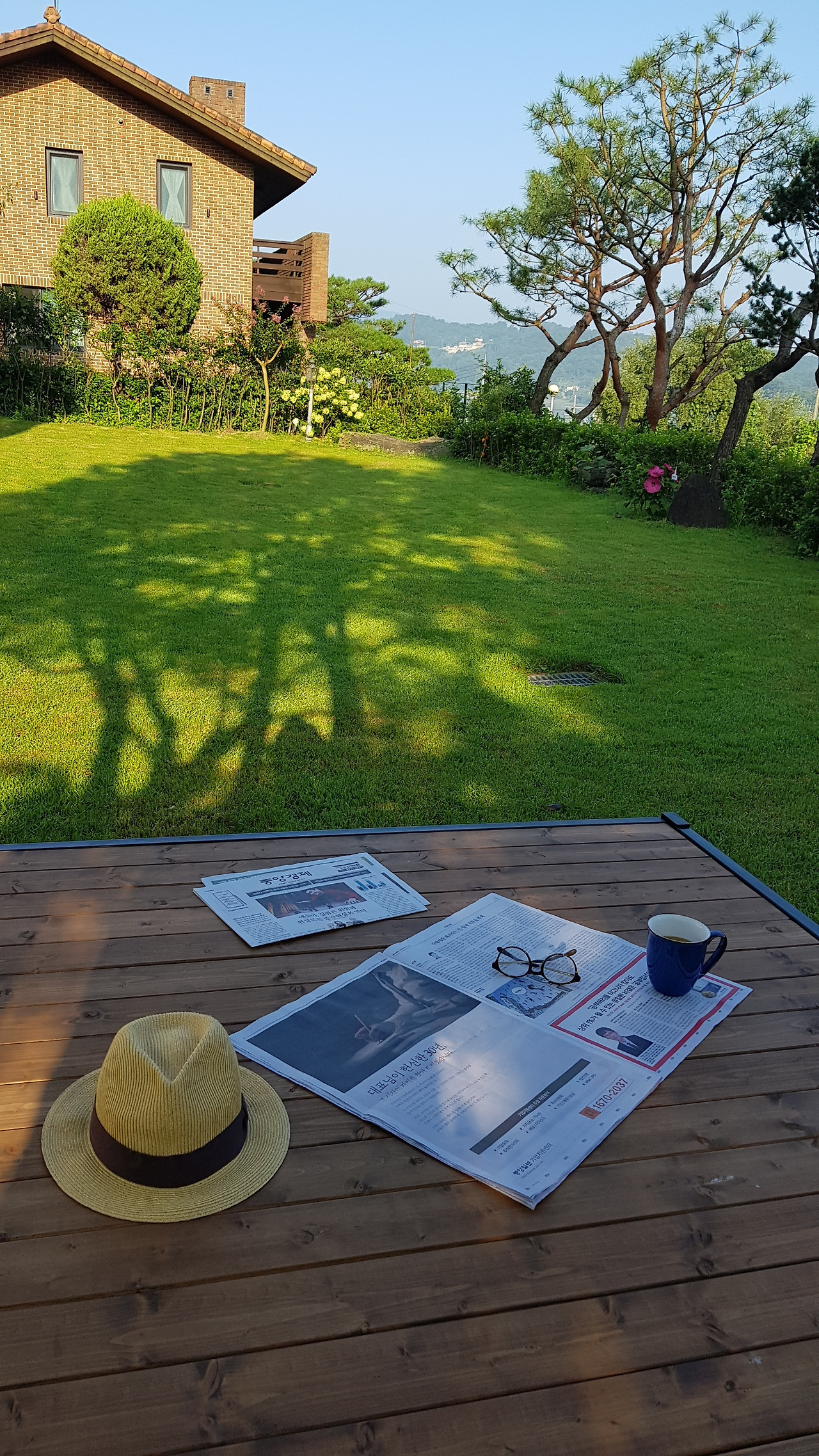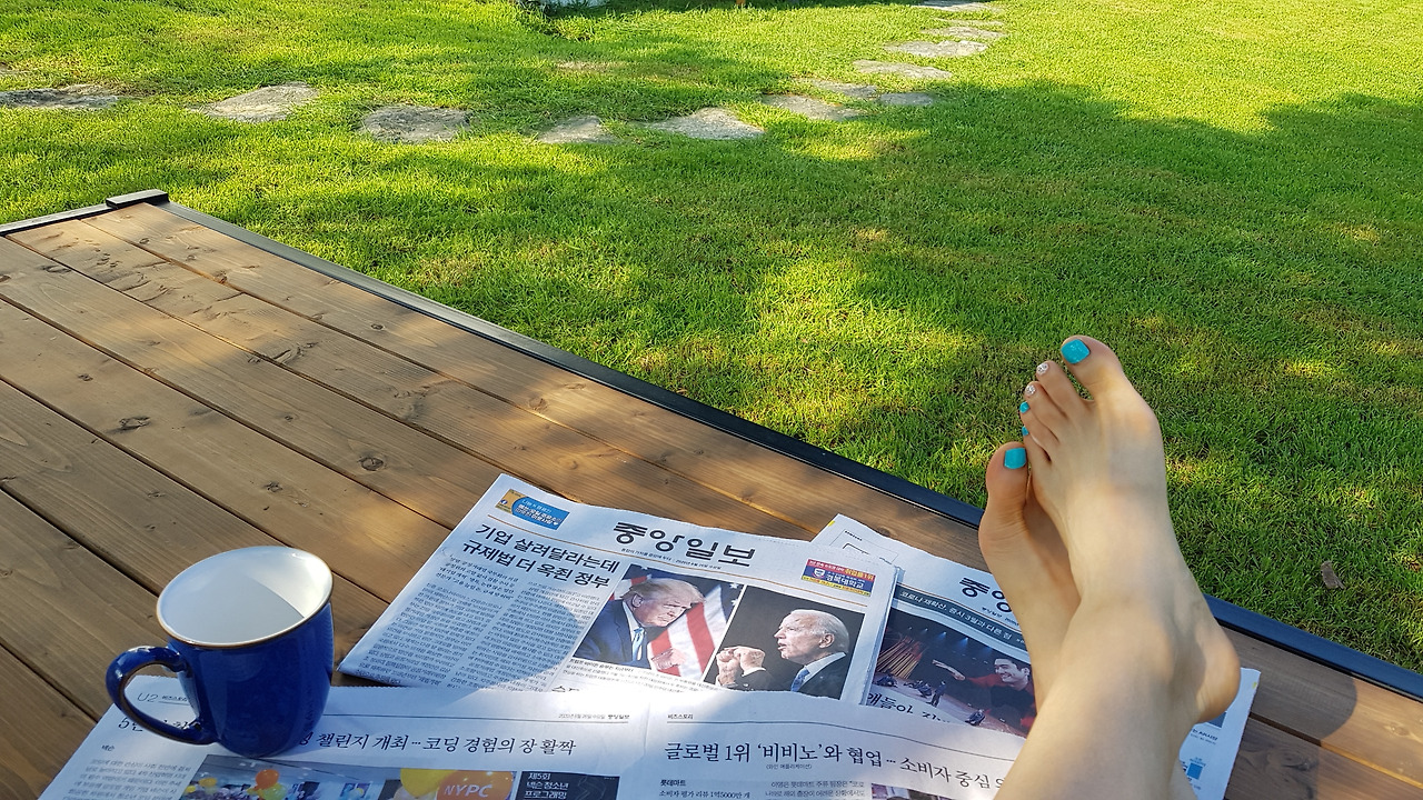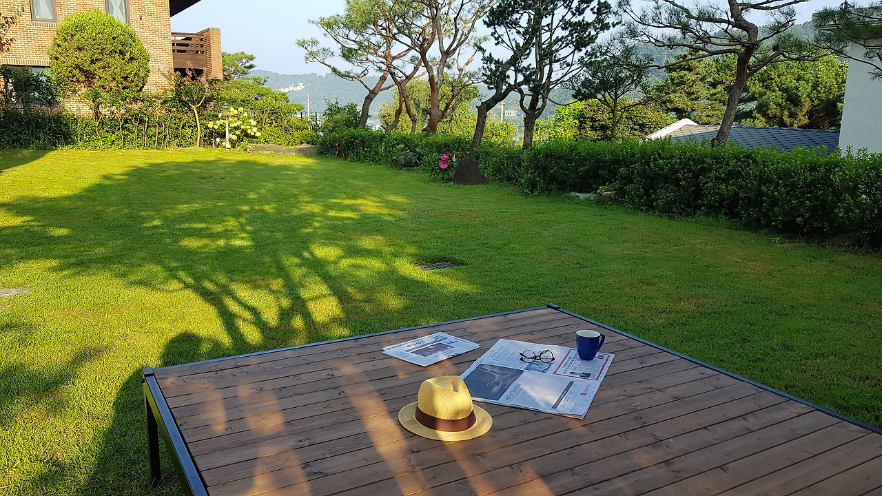 단풍나무 아래 평상에서 조간을 펼치며