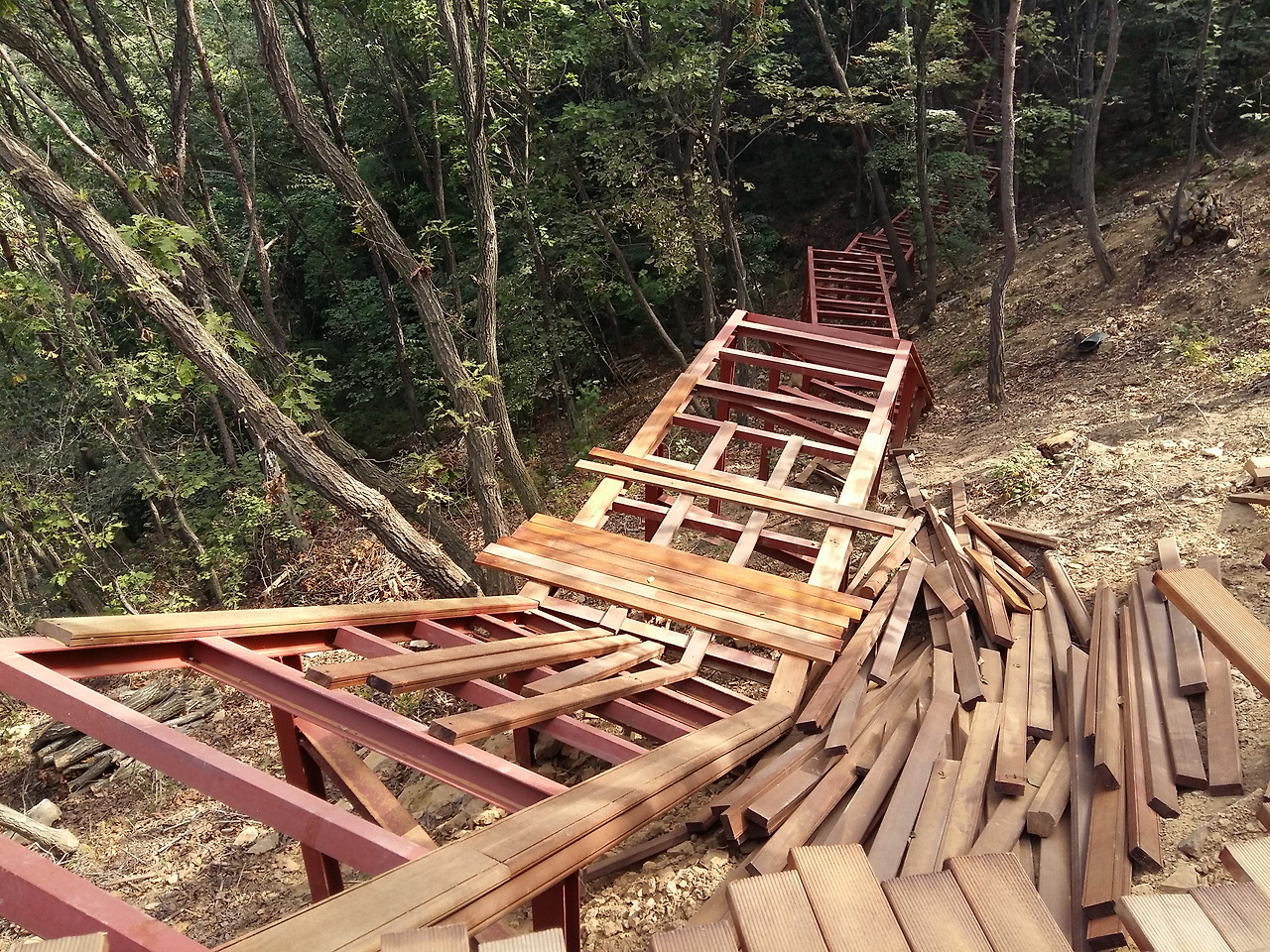 출렁다리 구경꾼들과 등산객으로 도로가 비좁다. 도롯가 언덕에 주차해둔 차량이 뒤로 미끄러져 굴러떨어질까 봐 조마조마하다. 위험한 현장이다. 출렁다리 입구 산아래서는 운계폭포로 이어지는 테크 공사가 한창이다. 인파가 구름같이 몰려들면 주차 공간 확보 없이 이곳 지자체가 야심차게 계획한 연 100만 명을 수용하는 감악산 힐링테마파크가 잘 조성될지 걱정되기도 한다.