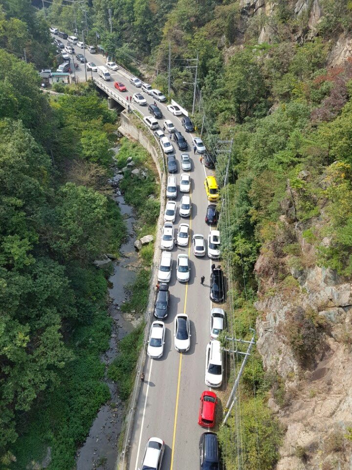 출렁다리 건너는 인파 속에 뒤섞여 다리를 건넜다. 다리 아래를 내려다보니 아찔하다. 적성 삼거리에서 양주시를 잇는 371 지방도로는 주차장을 방불케하여 빠져나갈 것을 미리 걱정부터 한다. 어디를 가나 주차가 문제이다. 그래도 다행인 것은 교통순찰차가 출동하여 교통정리를 하고 있다. 벌써 이런 조짐이 나타나는데 정식으로 출렁다리가 개통되고 힐링테마파크가 개장된다면 주차공간을 어떻게 해결할 것인지 해당 관계자는 고민이 깊어질 것만 같다.