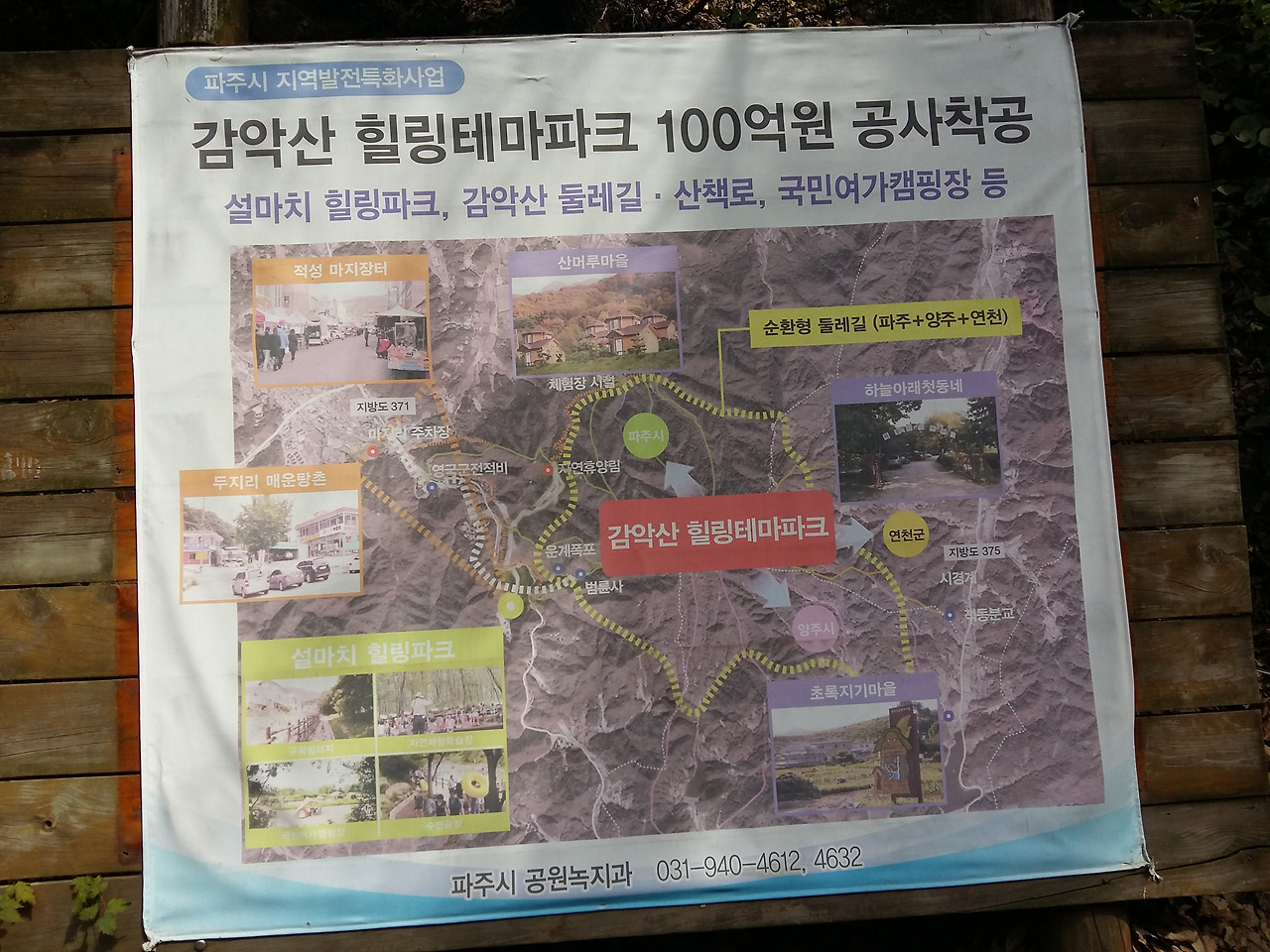 몇 년 전 우리 세 식구는 범륜사 사찰을 구경하고 임꺽정봉을 걸쳐서 까치봉, 장군봉, 정상에 올랐었다. 그때 빼어난 산세와 풍광에 놀랐다. 이번에는 집에서 좀 늦게 출발해서인지 범륜사 앞 지방 국도는 양방향이 심한 정체가 계속되었다. 도롯가 가장자리에 주차한 차량으로 오가는 차량이 움직일 수가 없다. 아마 출렁다리를 구경하러 온 사람들의 차량이다. 범륜사 오르는 입구는 차량의 출입을 막은 상태이다. 출렁다리로 오르다 보니 큼직한 간판이 세워져 있다. ‘감악산 힐링테마파크 100억 원 공사착공’ 조감도였다.