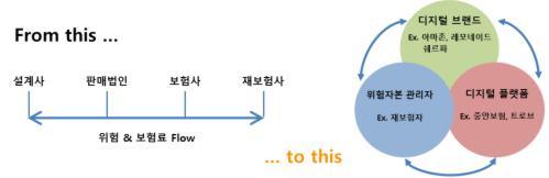 보험 유통은 설계사 등의 브로커로부터 시작된다. 보험회사는 브로커와 판매법인 등을 통해 위험을 인수하고 보험금을 지급할지 여부를 결정하며, 일정 부분의 위험은 재보험사로 그 위험을 다시 전가한다. 결국, 위험과 보험료가 한 중개자에서 다른 중개자로 옮겨가는 형태로서 지난 수백 년 동안 변화한 적이 없는 모델이다. 보험의 과도한 유통마진과 비효율성은 인슈어테크의 급부상과 함께 모델에 대한 파괴적 혁신이 가속화되고 있다. 보험산업이 4차 산업혁명의 흐름 안에서 보험의 공급체인에 대한 재정의가 이미 시작된 것이다. <그림 참조>