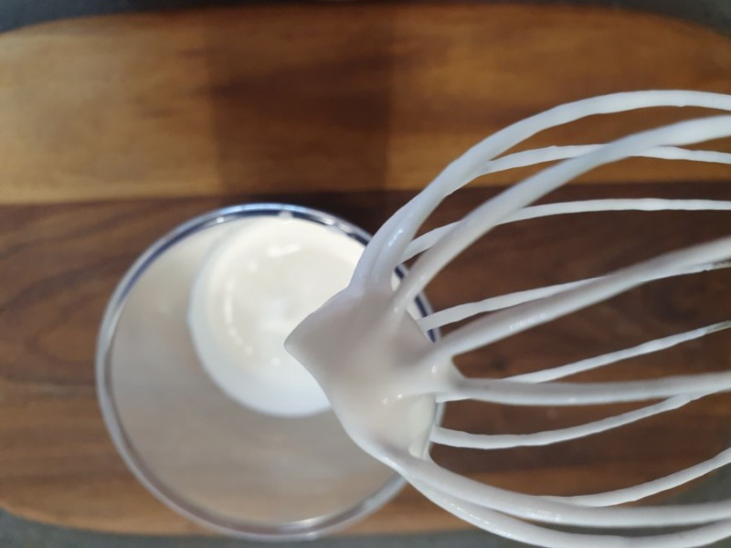 2. 생크림 100미리에 설탕 1큰술을 넣고 휘핑한다. 이때 거품은 들어올렸을 때 뾰족한 뿔이 휘어질 정도.