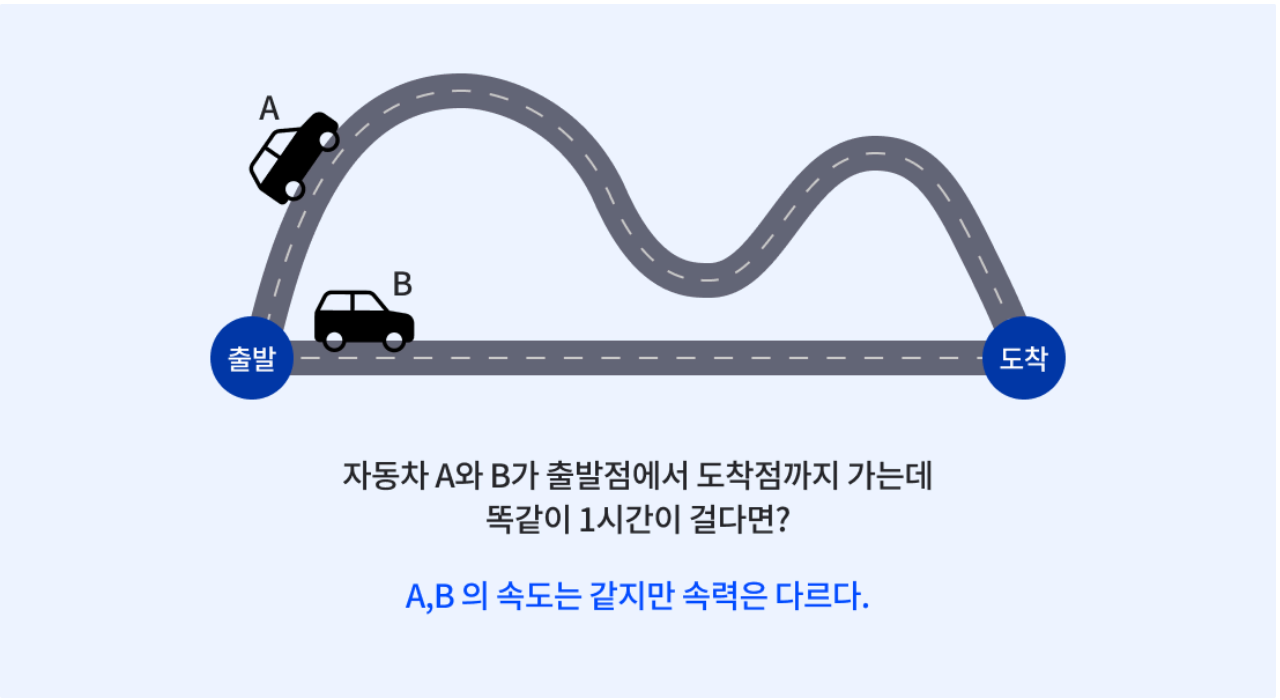 속력과 속도의 차이에 대해서 알고 계신가요? 속력이란 단위 시간 동안에 물체가 이동한 거리를 의미합니다. 반면 속도는 물체의 단위 시간당의 변위를 의미합니다. 변위란 출발점을 기준으로 할 때 도착점까지의 직선거리를 뜻합니다. 뜬금없이 이 이야기를 꺼낸 이유는, 속도와 속력의 개념의 차이가 우리의 문제를 잘 설명한다고 생각했기 때문입니다.
