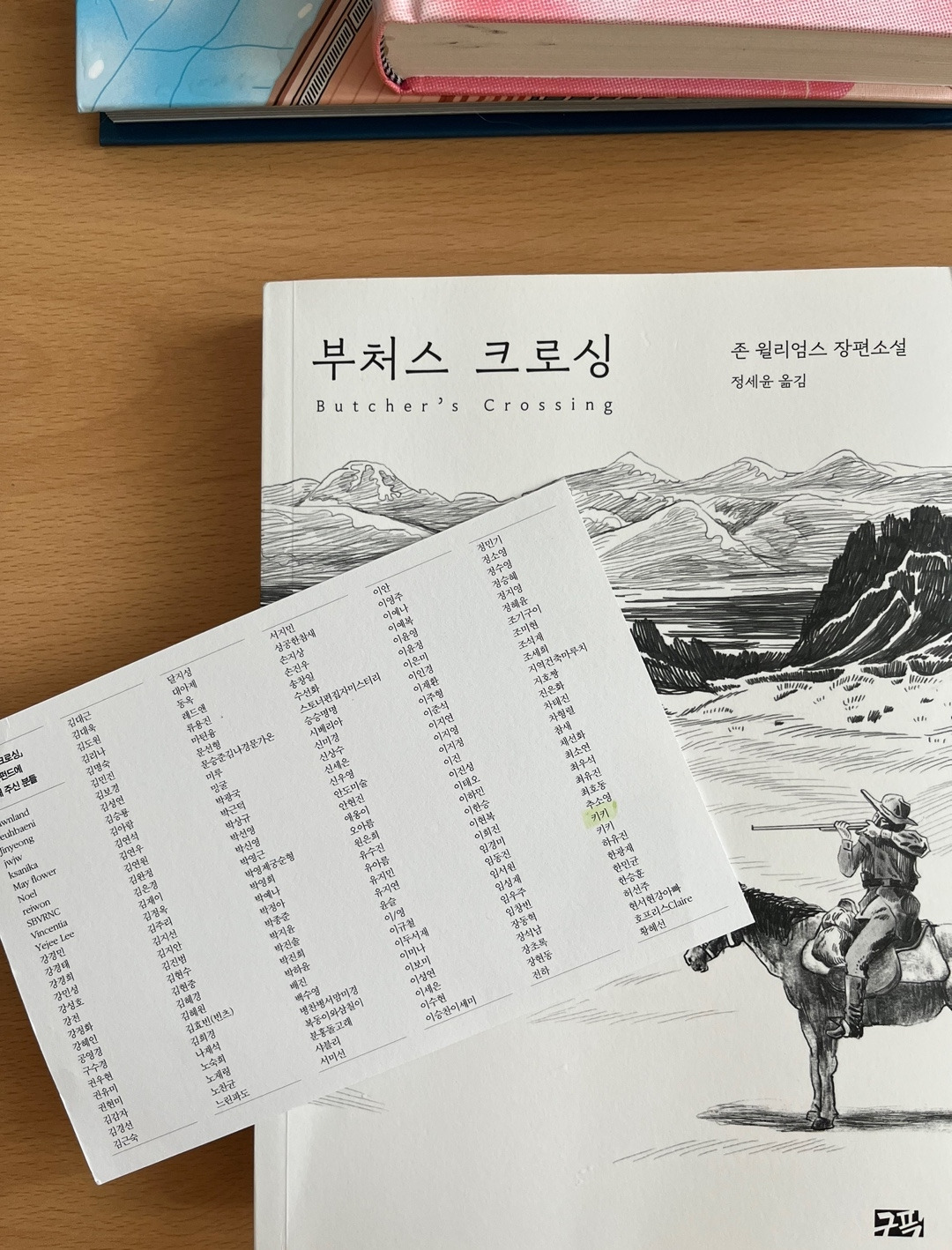 알라딘 북펀딩에 참여해 존 윌리엄스의 <부처스 크로싱>을 받았다. 우연히 발견한 펀딩에 참여한 이유는 단연 <스토너>의 작가였기 때문이다. 단정하고 고요해 보이는 문장에 꽉꽉 들어찬 밀도와 열기가 고스란히 느껴졌던 책. 여기저기 선물도 많이 했다. 그런데 <스토너>.. 너무 유명해져서 어디서 인생 책이라고 말하기가 조금 멋쩍어져 버렸다..