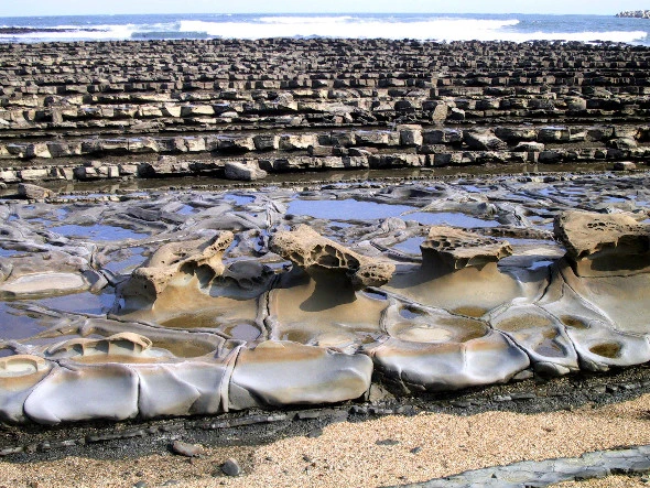 아오시마 주변 해안에는 '도깨비 빨래판'으로 불리는 자연 암반 지형이 펼쳐져 있다. 이 지형은 파도에 의해 침식되어 형성된 것으로, 규칙적인 줄무늬가 인상적이다.