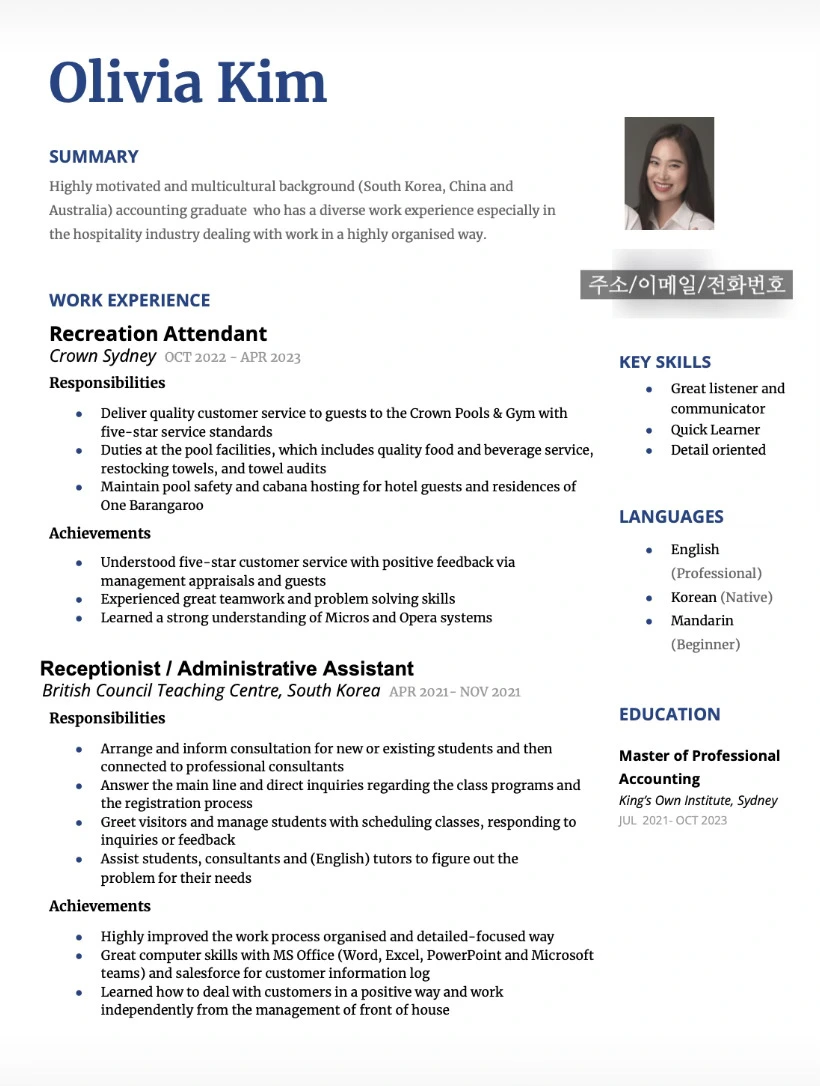 해외 경험, 서비스 경력, 회계 전공을 어필했다.
