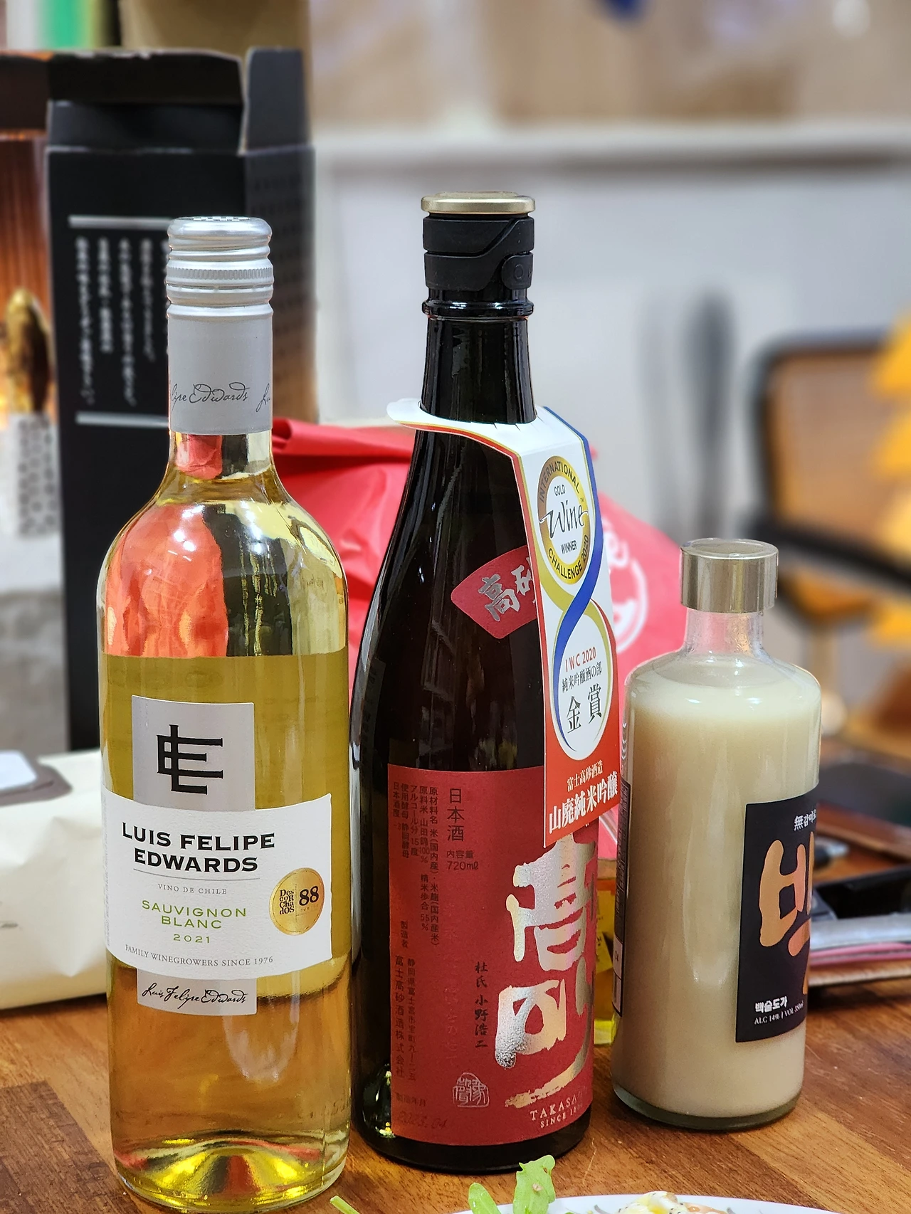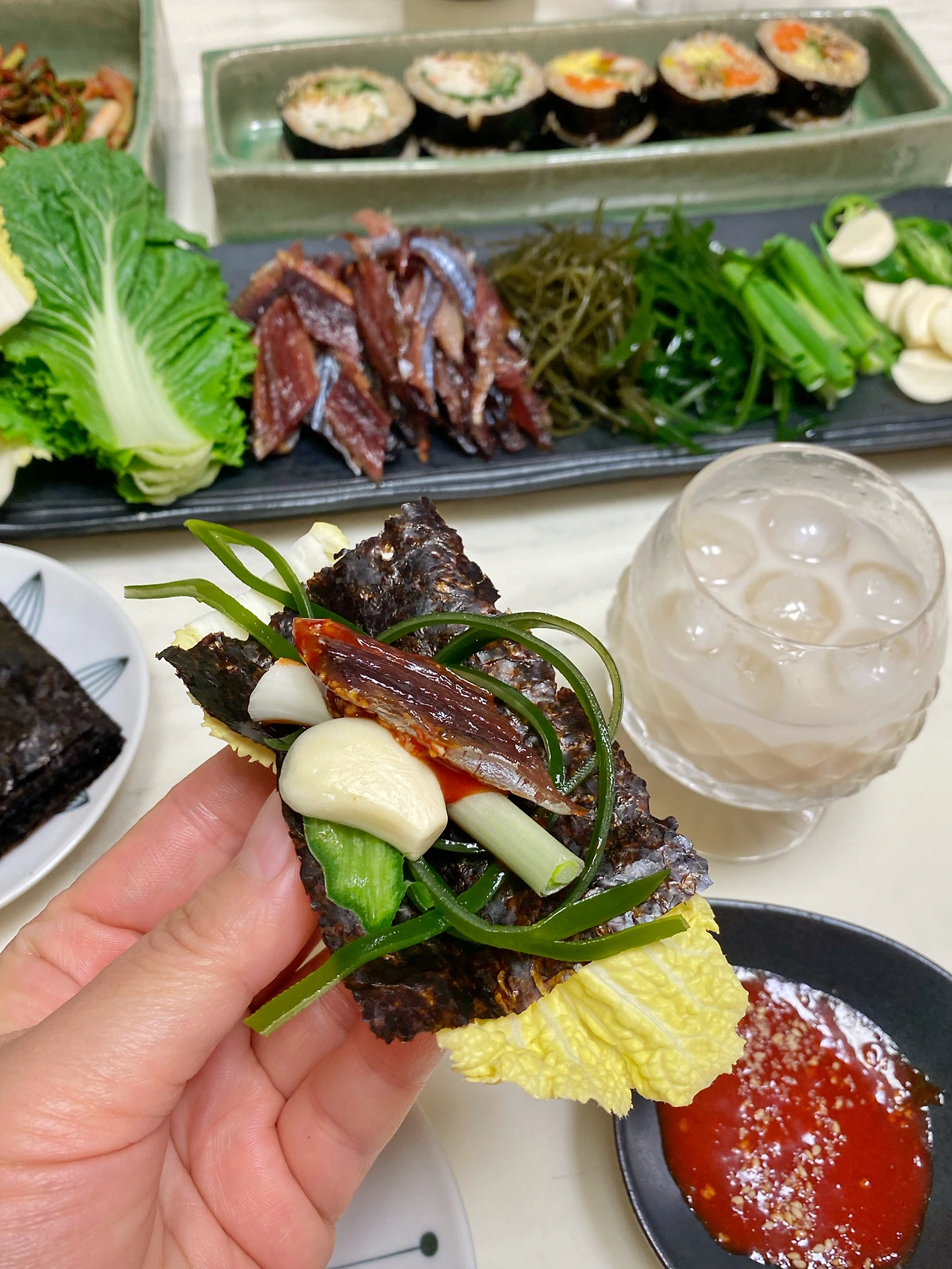 알배추나 봄동에 김을 얹고 다시마나 물미역도 좋은데 이번에는 배달이 온 꼬시래기와 해초를 올린다. 초장을 묻힌 과메기를 얹고 쪽파, 마늘, 고추를 넣어 한쌈 가득 입안에 넣는다. 고소하고 쫄깃한 과메기와 알싸한 마늘, 쪽파, 바다맛이 나는 해초, 김, 물기를 머금은 신선한 알배추 등등 여러 가지가 섞이며 입 안에서 하나의 소우주를 만들어낸다. 씹을수록 고소하고 시원한 맛이 어우러진다. 쓰다 보니 입에서 침이 고인다. 과메기는 소비뇽 블랑을 페어링 하면 좋다. 화사한 화이트 와인의 향이 과메기와 잘 어울린다. 화이트 와인과 함께 마시다 사케 한 병을 더 마셨다. 술이 술술 들어간다.