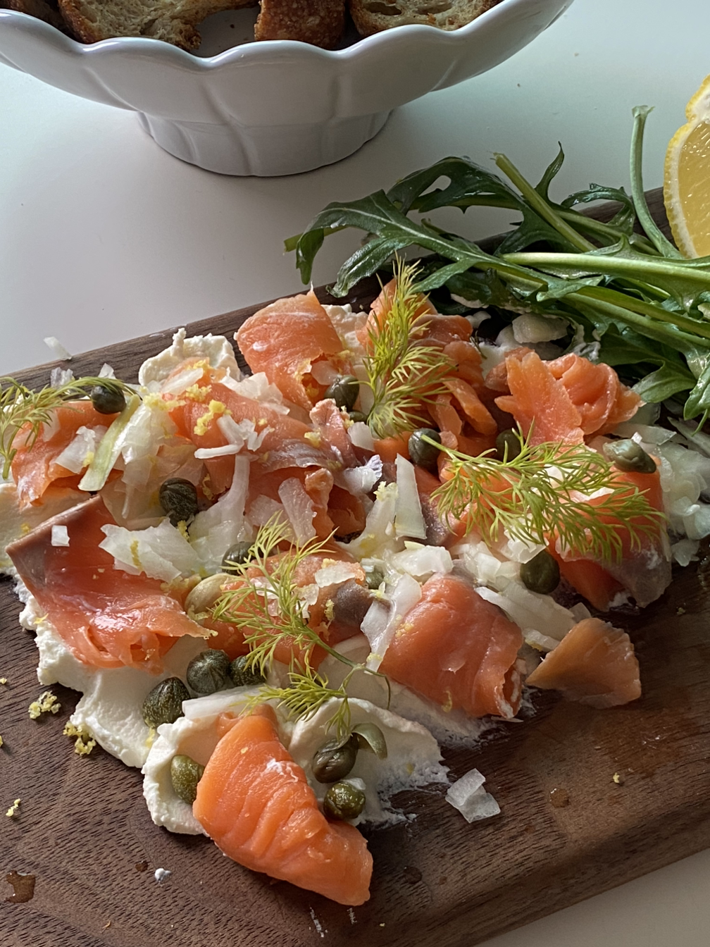 얼마 전 한밤중에 인스타그램에 뜬 연어 요리를 보다 문득 먹고 싶어져 새벽배송으로 훈제 연어를 주문했다. 오랜만에 먹으려고 보니 케이퍼와 홀스래디쉬 소스도 없어서 모두 주문해야 했다. 용량이 큰 것들을 주문하려다 또 언제 먹을까 싶어서 작은 것으로 샀다. 다음날 훈제 연어가 왔는데 또 먹고 싶다는 생각이 들지 않아 며칠을 방치했다. 이러면 안 되겠다 싶어서 한참 자주 보이던 연어 스노보드를 만들었다.
