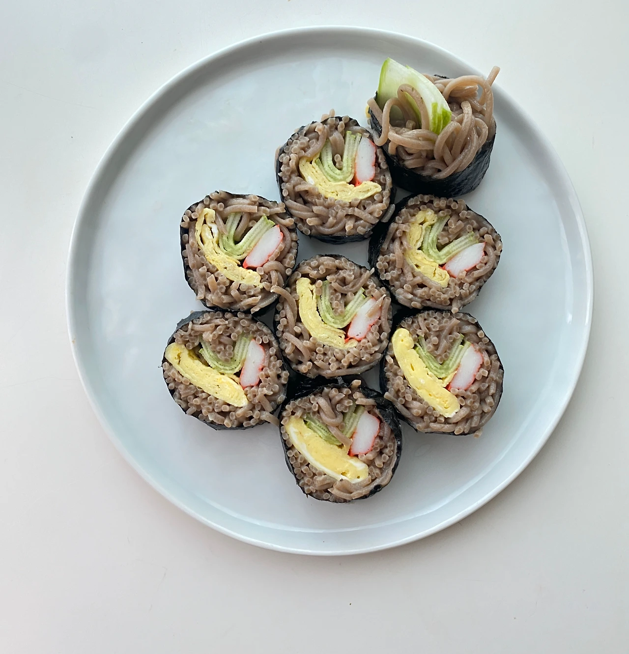 메밀국수 김밥을 처음 접한 것은 몇 해 전, 마스터 셰프 코리아의 우승자였던 최강록 씨가 운영하는 식당에서였다. 메밀로 김밥을 싼다는 것을 처음 봤을 때는 어떻게 이런 요리를 할 수 있나 싶어 신선하고 신기해했던 기억이 난다. 맛을 보니 맛도 있었지만 직접 만들어볼 생각을 하지는 못했다. 누군가의 요리를 보면 나도 한 번 해볼 수 있겠다 싶은데 메밀국수 김밥은 쉽게 해 볼 생각을 못했다. 그러다 메밀국수 김밥을 다시 보게 된 것이 인스타그램이다. 그 사람의 관심사를 알아보려면 인스타그램 돋보기 (탐색 탭)을 보라는 말이 있는데 내 돋보기에는 요리 콘텐츠만 뜬다. 1,2년 전쯤부터 인스타그램에서 찾아보는 것이라고는 요리와 여행 릴스뿐이라 알고리즘이 두 가지만 번갈아 보여준다. 계속 보다 보니 요즘에 인기가 있는 음식이 무엇인지, 유행하는 요리 릴스 스타일을 대략적으로나마 짐작할 수 있는데 작년 여름에는 이 메밀국수로 만든 김밥이 한창 인기였다. 막상 만드는 영상을 보니 그리 어려워 보이지는 않아서 한 번 도전해 볼 수 있겠다는 생각이 들었다. 그 당시 낭독 모임 때문에 현미김밥을 자주 싸던 때라 밥과 재료들을 하나씩 다 준비해야 하는 김밥에 비하면 상대적으로 쉬워 보였던 것도 있다. 음식만 볼 때는 어렵게 여겼는데 만드는 영상을 보니 생각의 벽이 쉽게 무너졌다. 몇 가지 영상을 보고 혼자 레시피를 정리해 만들어 보기로 했다.