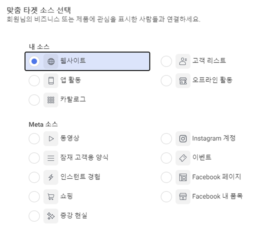 이전에 광고 타겟을 세팅할 때 함께 세팅해주는 것인데요. 이는 주로 리타겟을 위해 활용하는 겁니다. 그래서 우리는 “내 소스 -> 웹사이트 트래픽”을 이용합니다.