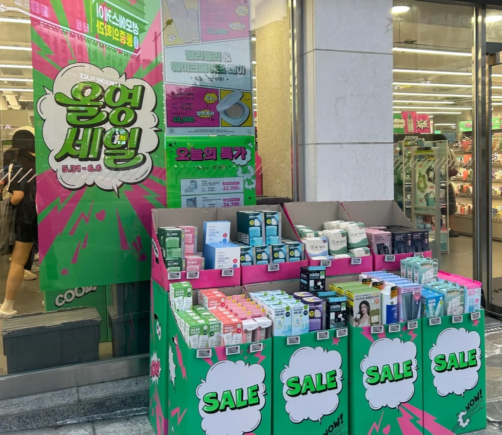 올영픽 중에서도 선케어 존은 조금 더 계절감에 맞춘 구성이 인상 깊었어요. Dr.G, 샘물나라, 브링그린이 대표 브랜드로 진열되어 있었고, 슬로건은 “피부 기상센터 속보! 자외선 폭주! 지금은 막아야할 단계!" 라는 재치 있는 문구가 붙어 있었어요. 여름철 수요를 겨낭한 강력한 메세지로 봤어요.