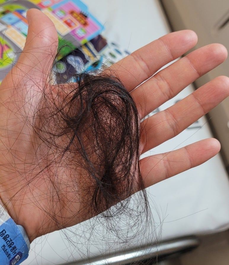 그러던 어느 날, 옷에 붙은 몇 가닥의 머리카락이 눈에 띄기 시작했다. 침대 위에도, 식판에도, 3~4가닥씩 떨어져 있었다. 탈모가 진행되는 시기는 다 다르다고 한다. 보통은 항암 3~4주 차쯤 빠지지만, 아이에 따라서 거의 빠지지 않는 경우도 있다고 들었다. 막내는 이제 시작인 것 같았다.