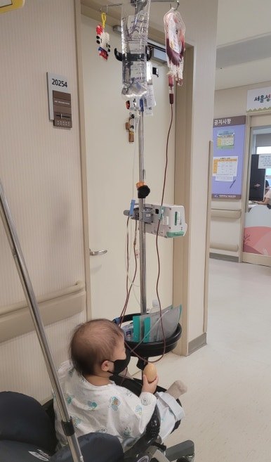 혈색소 수혈은 약 2시간이 걸린다. 혈액팩을 폴대에 걸고 병동용 유모차로 산책을 하거나 장난감으로 놀면서 시간을 보내고 있었다.