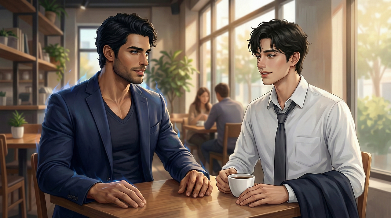 조금 뒤, 말쑥한 양복을 차려입은 휘가 카페에 들어왔다. 그는 자신을 향해 손을 흔드는 날 보고서 순간 멈칫했다.