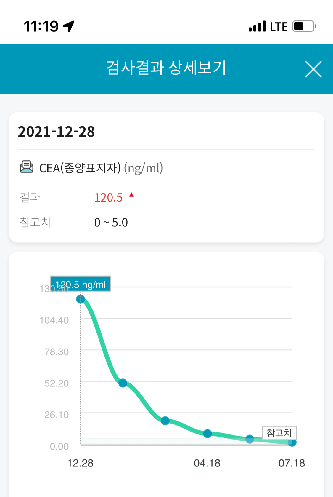 2021년 12월 120.5에서 시작했던 암 수치는, 22년 7월 1.7이라는 숫자로 급격히 떨어졌다.