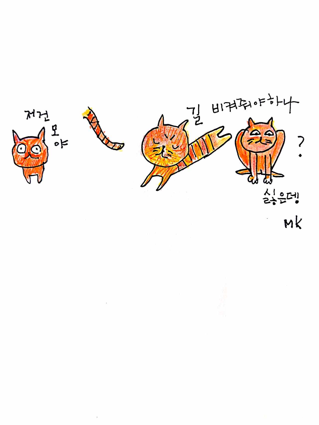 한적한 숲길에 햇빛이 환하게 비치는데 길 한가운데서 동네 떠돌이 갈색 고양이 세 마리가 떡하니 길을 가로막고 앉아 햇빛을 쬐고 있었다.