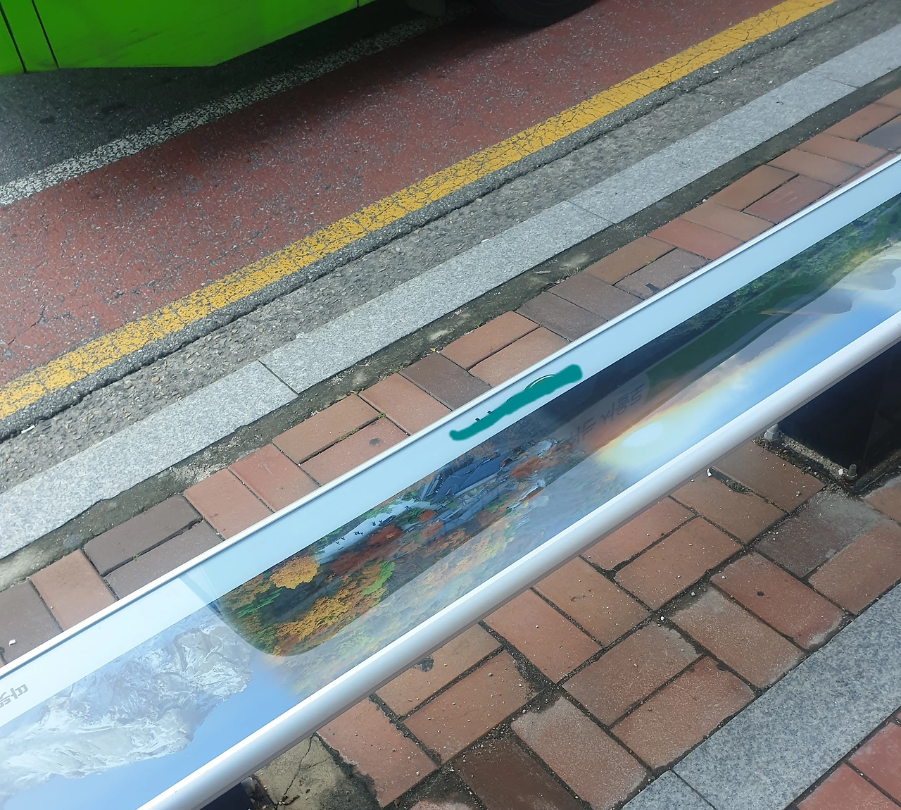 버스정류장에 지자체에서 만들어 놓은 긴 간이의자다. 날이 쌀쌀 해지면 의자는 따끈한 온돌로 변한다.