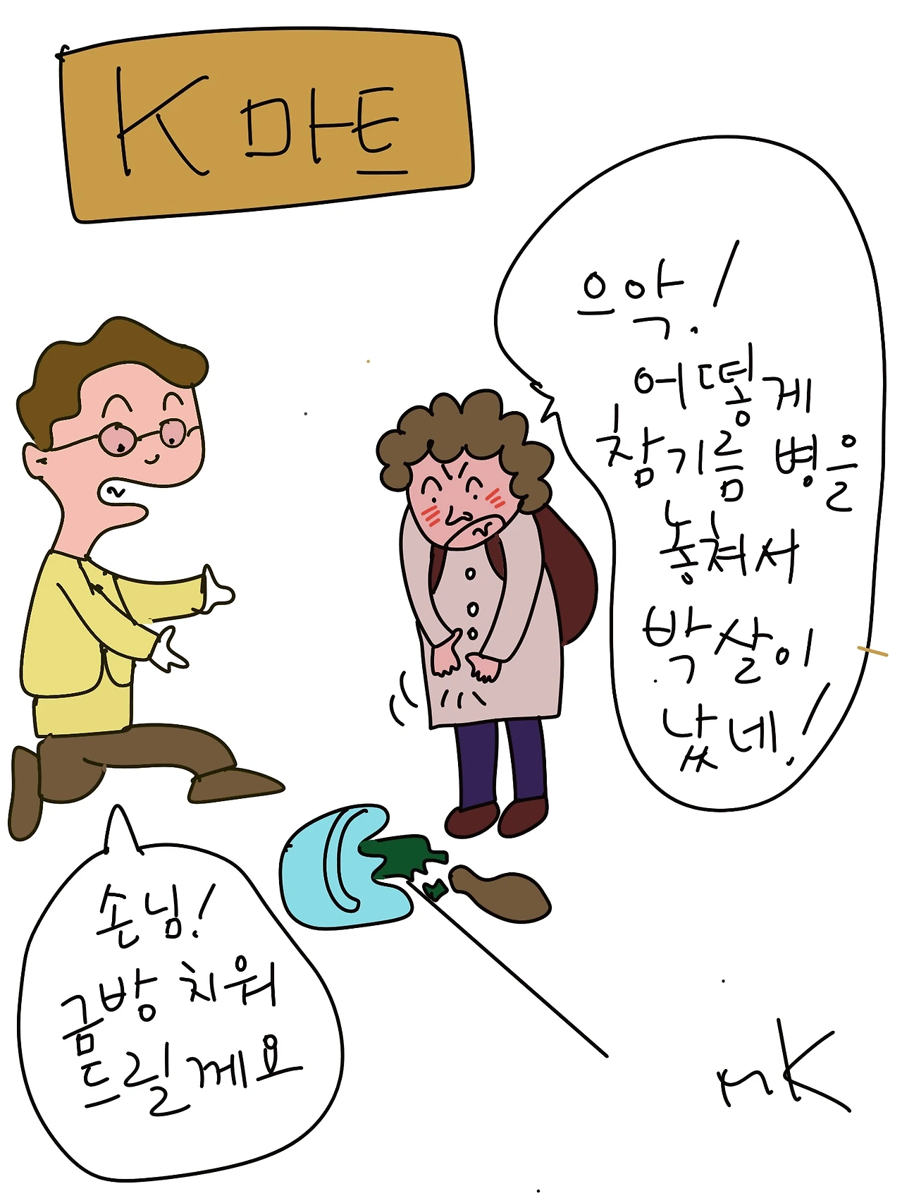 당황한 아주머니가 어쩔 줄 모르고 있는데 마트 직원이 싫은 내색하나도 없이 득달같이 달려와 아주머니를 진정시키고 참기름병을 치우며 청소를 하니 표정과 공기부터 차분해진다.