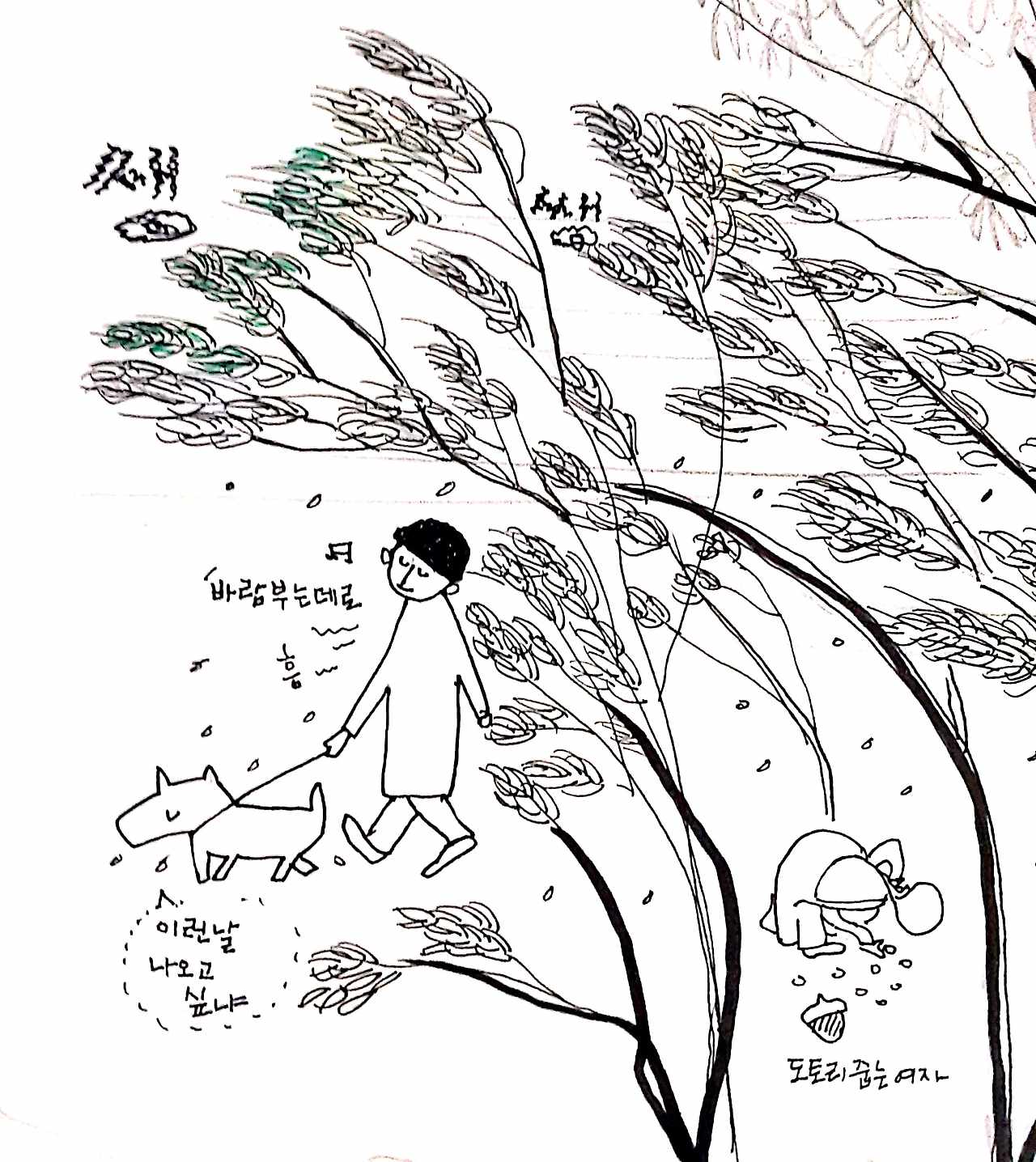 개 끌고 산책하는 남자도보였는데 바람이 등 떠미는 데로 개 한 마리 끌고 걷고 있다. 개는 명랑해 보이지 않는 것같은데비바람 속에 걸으니 털이 젖어서 일게다.