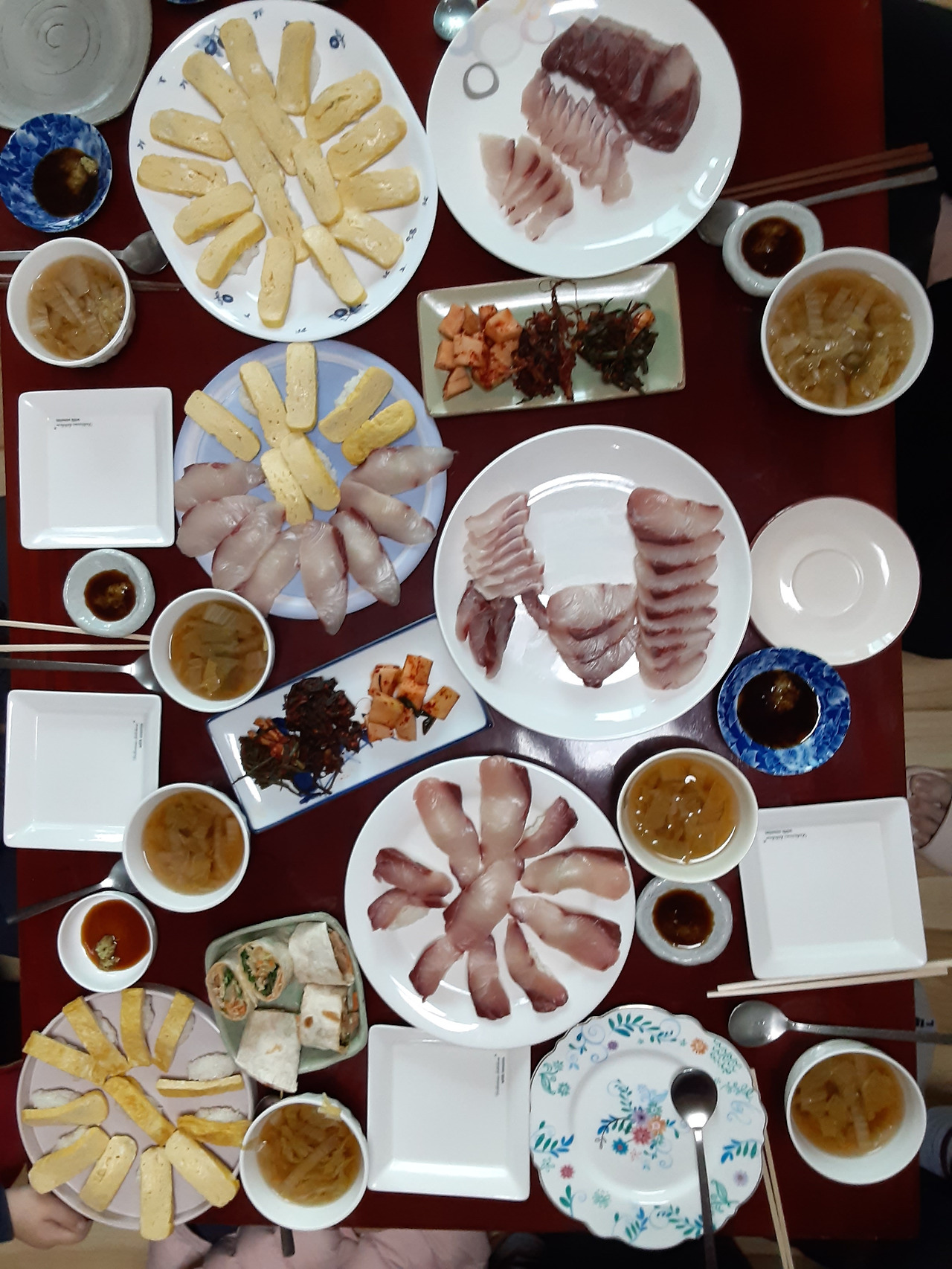 시댁 식구들이 앉아 이 이야기 저 이야기하며 쉬자 비닐랩에 잘 싸여 있는 방어 오로시를 보고 가라앉았던 기분이 풀렸는지 남편은 ' 방긋'하며 손수 회를 뜨고 계란 초밥을 만들었다. 끝은 훈훈하게 계란초밥과 방어회 방어 초밥으로 한상 차렸다. 푸짐하네.