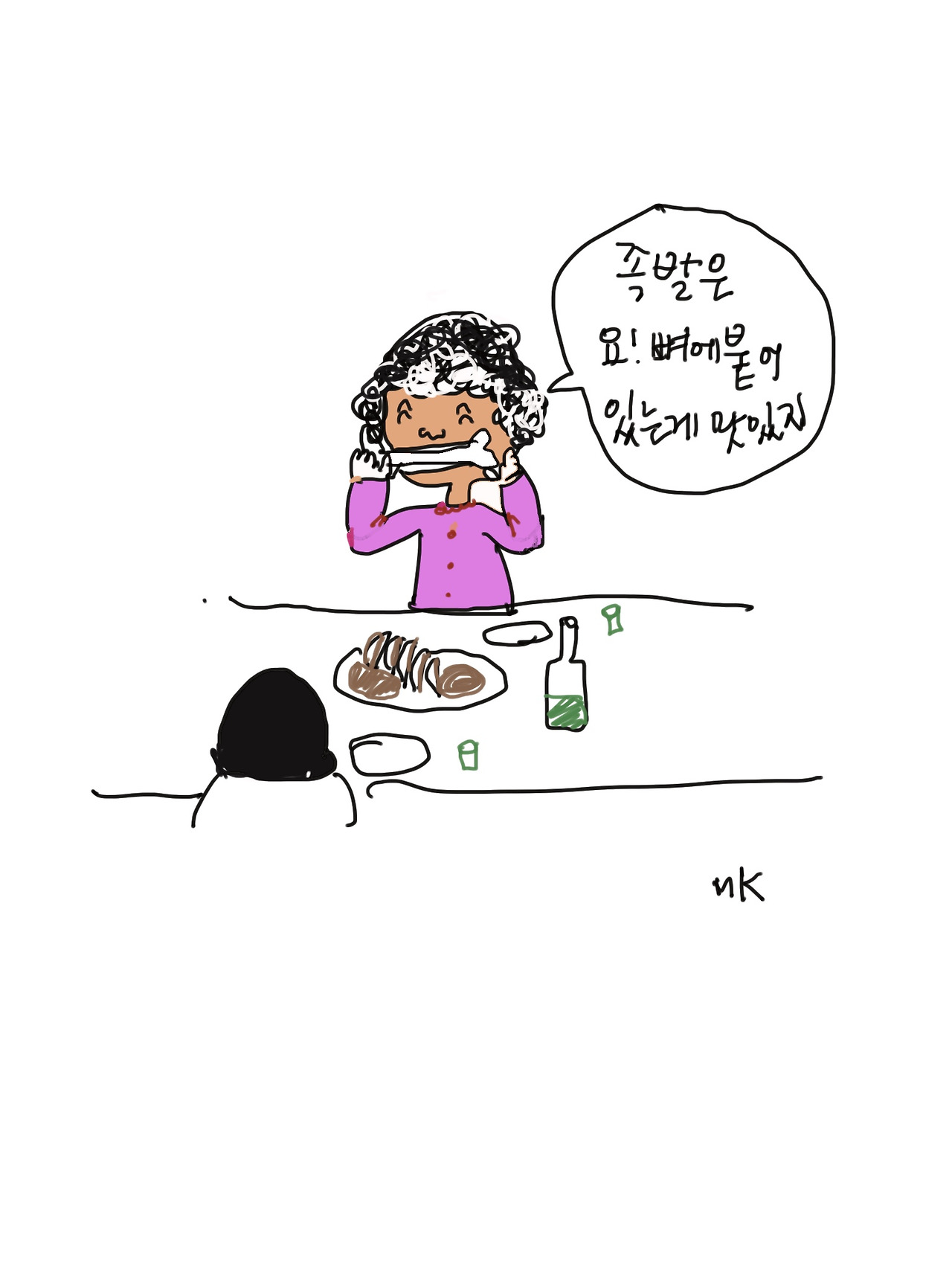 그런데 자꾸 먹다 보니 족발 껍질의 콜라겐의 쫄깃한 부분이 맛있다. 친정엄마도 식구들 좋은 거 주려고 했던 게 아니고 진짜 맛있어서 먹는 거였으면 하는 맘이 간절하다.