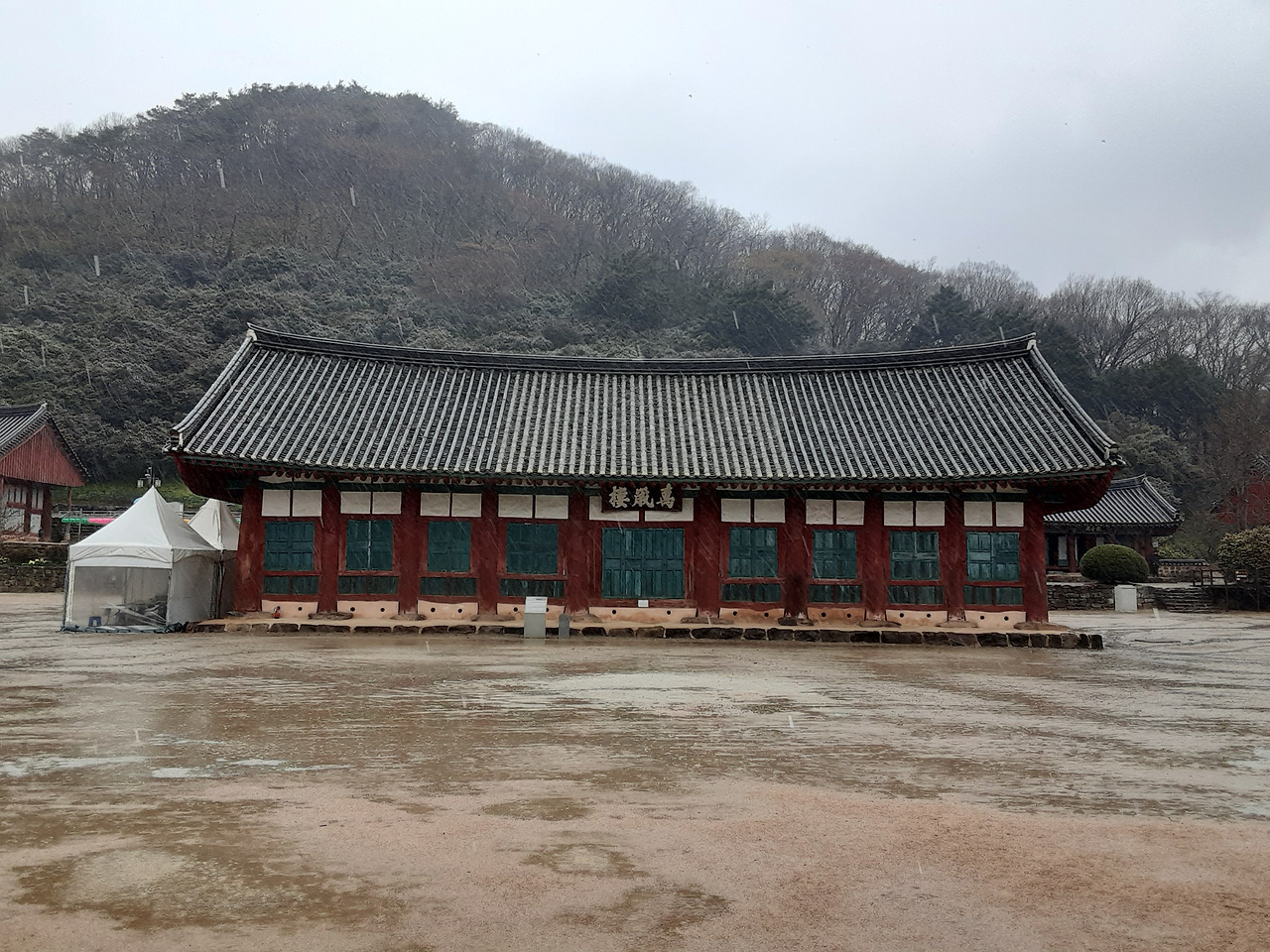 남편은 신발이 젖어서인지 별로 걷고 싶지 않아 해서 만세루에 앉아 있기로 하고 시누이네와 대웅전 뒤편의 동백숲으로 갔다.