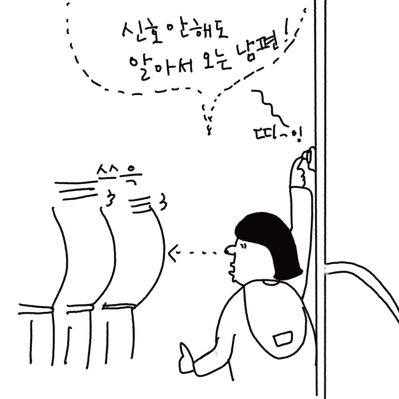 집으로 돌아오는 길에 버스에 자리가 없어서 나는 앞쪽에 남편은 맨뒤에 앉았고 사람들로 북적였다. 환승할 지점이라 내려야 하는데 남편에게 어떤 방법으로 알려야 할까 잠깐 고민했다.