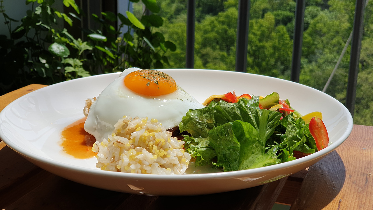 꽃 같은 계란 프라이를 썬 라이즈로 익혀서 가니쉬로 샐러드를 곁들인다.