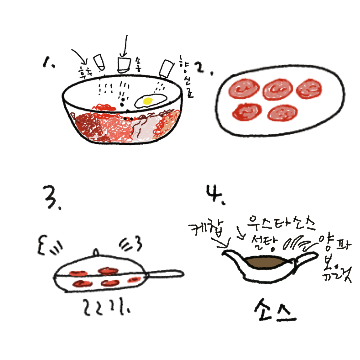 소스는 케첩 우스타 소스나 간장 양파 볶은 것을 넣어서 설탕 소금으로 조금 간을 맞추고