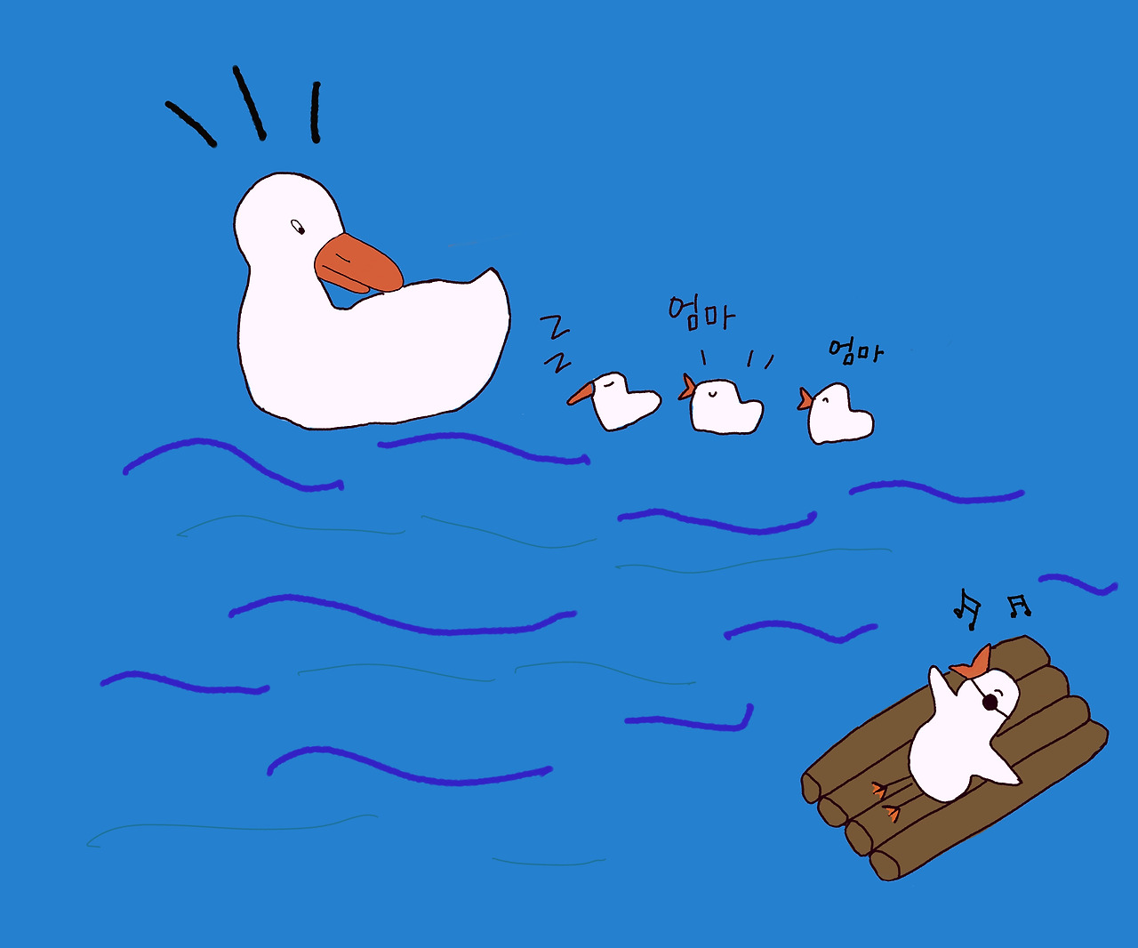 헤엄치는 방법을 가르치는 엄마 곁에서 헤엄 치는 것보다 만들기 대장 미운 아기 오리는 뗏목을 타고 다니는걸 더