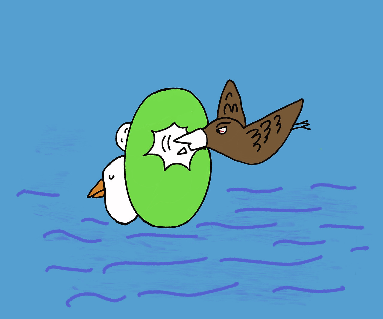 그러던 어느 날 사나운 매가 공격을 하려고 호수 위를 맴돌고 있어요.