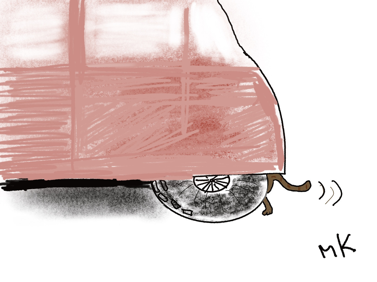 길고양이 천천히 차 밑으로 몸을 숨긴다.
