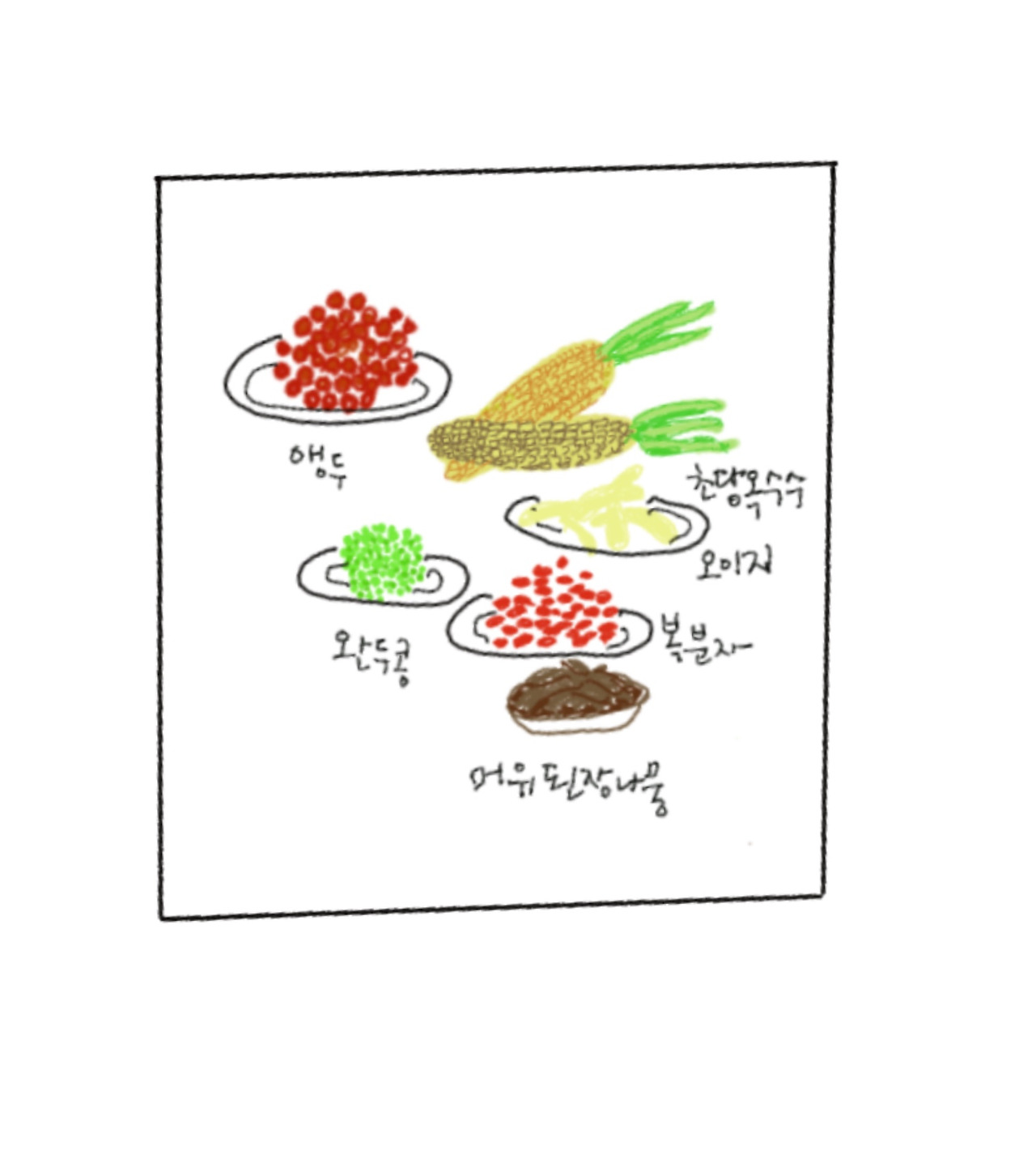 앵두 복분자 오이지 머위 된장지짐 완두콩 참외들 물건이 좋으면 손 큰엄마가 많이 사서 딸들에게 나눠준다.