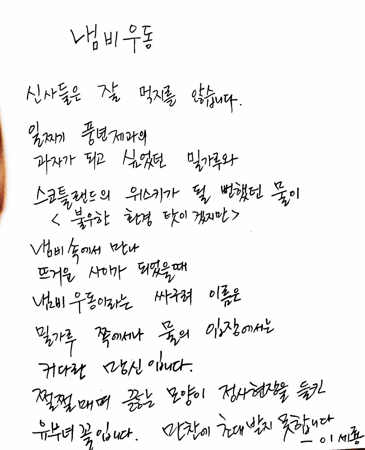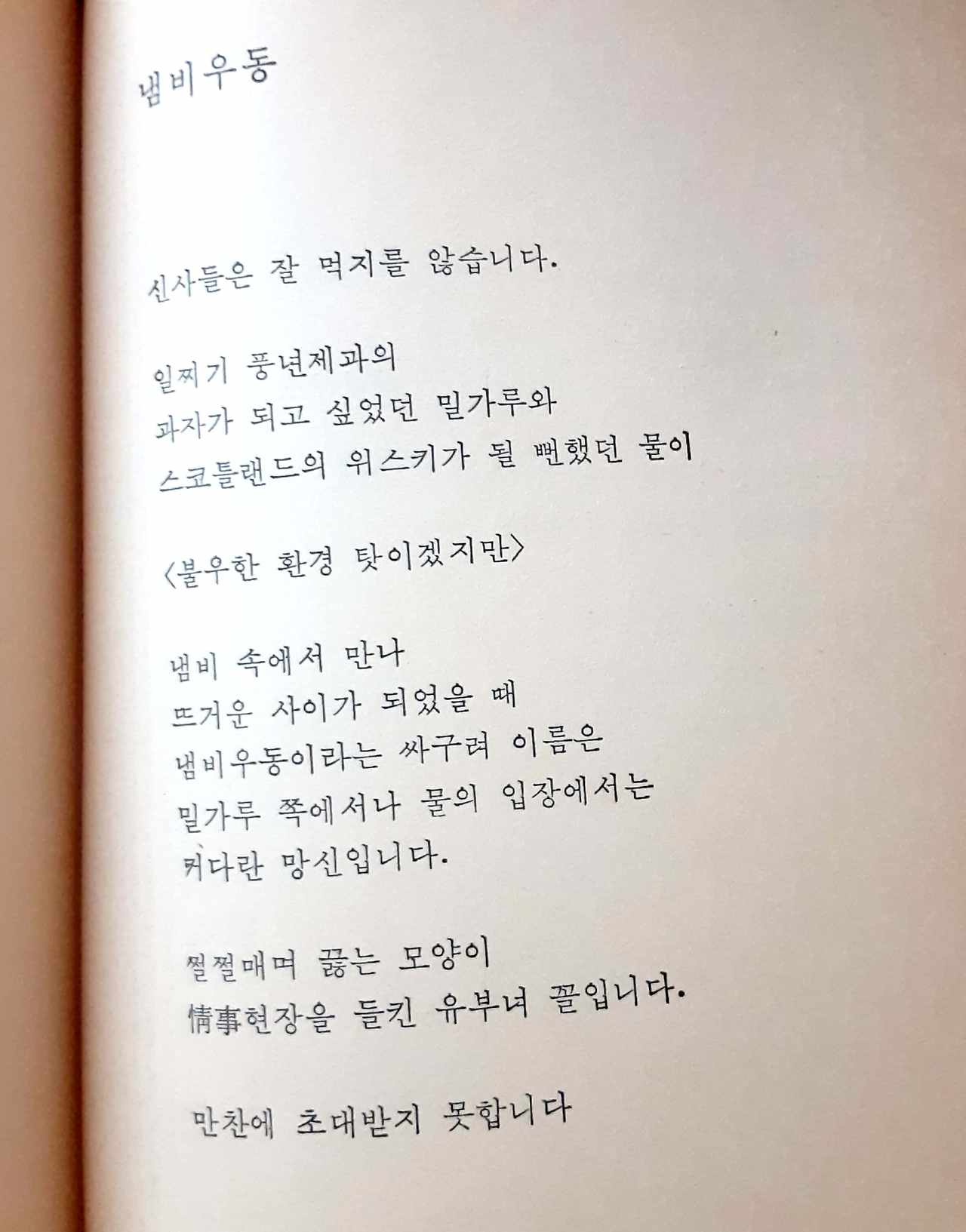 시 때문에 결혼도 하고 가난한 청춘시절 어스름 날의 위안도 받았기 때문이다. 결혼은 날개 달린 백마 탄 왕자를 만나는 것이 아닌 혹독한 현실을 헤쳐나가며 같이 걷는 거라는 걸 깨닫게 해 준 시였다.