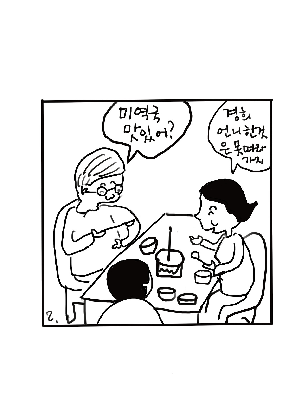 나는 언제부터인가 미역국 맛을 경희 언니가 만든 미역국과 비교하는 버릇이 생겼다. "경희 언니보다 맛있거나 맛없거나"이다.