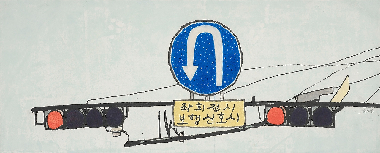 한국화가 김선두 화백의 유턴 그림이었는데 무수하게 장지에 색을 우려내듯 여러 번의 칠 작업을 한 뒤에 크로키식으로 그린 그림이다.