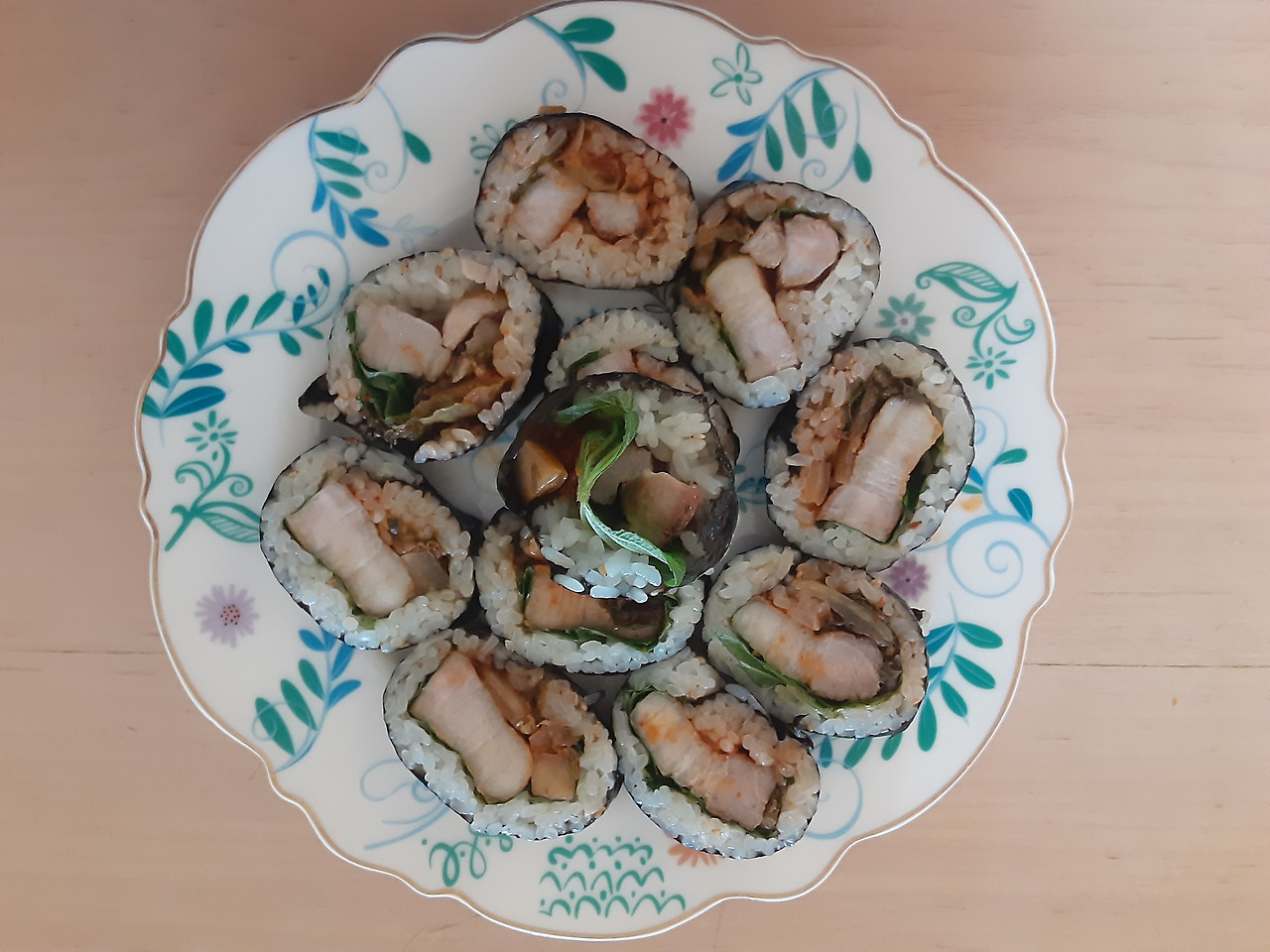 삼겹살 김밥은 어떤 맛일까 궁금해서 깻잎과 쌈장 삼겹살을 넣어 김치를 볶아서 만들어 봤는데 삼겹살의 물렁한 식감과 김이 조화롭지 못했다.