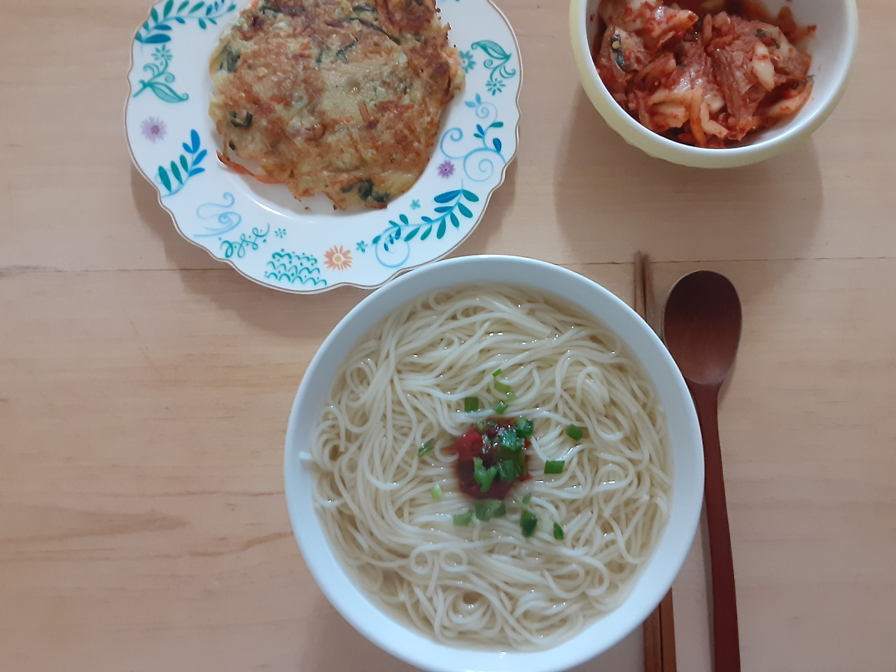 쫄깃하고 짭조름한 구포국수면을 삶고 빨강 청양고추와 녹색 청양고추 파 양념이 들어간 단풍 같은 양념간장을 조금 넣어 먹는다.