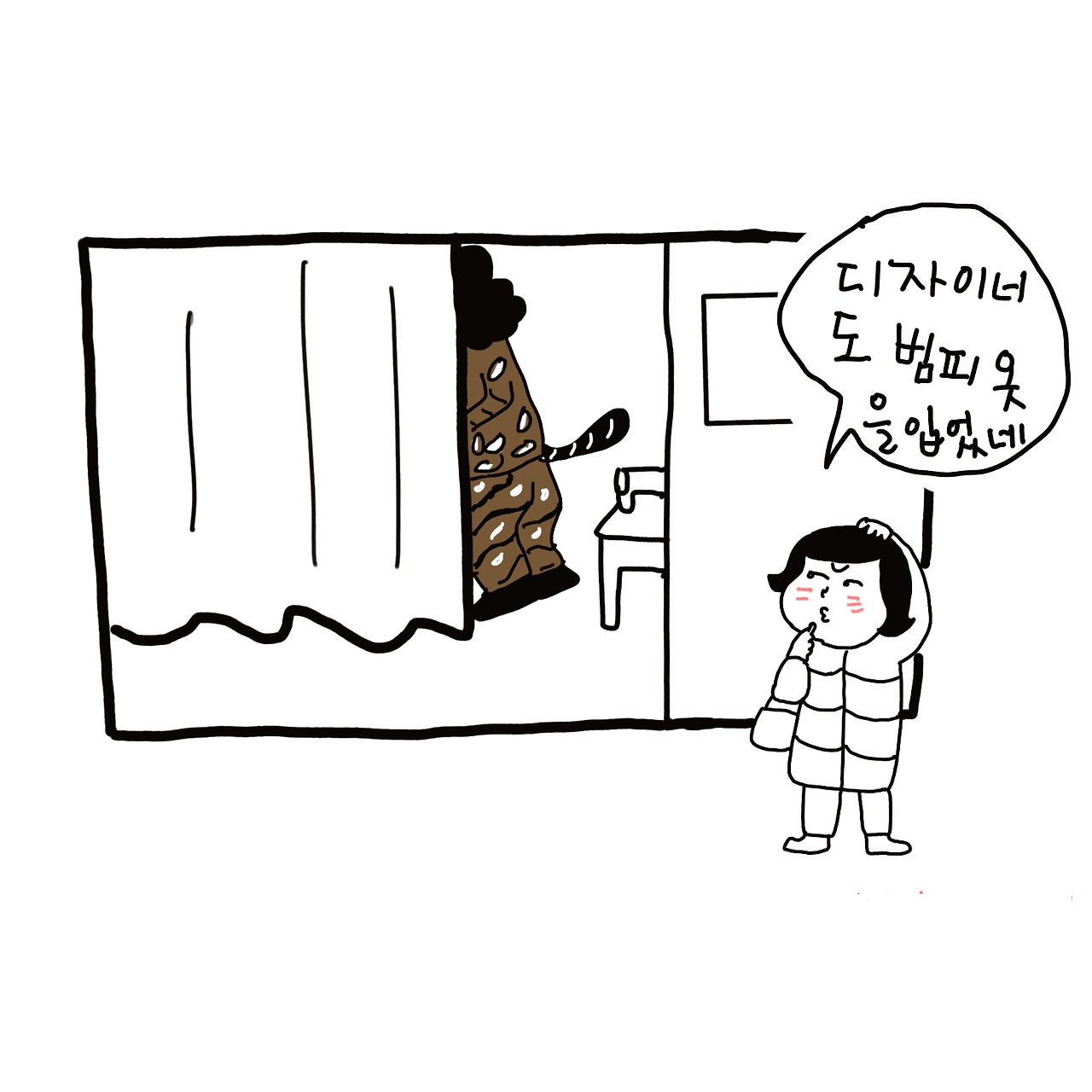 하며 계속 호피 옷의 쇼 윈더를 구경하는데 안쪽에 디자이너분이 커튼 반쯤 몸을 가리고 작업을 하고 있었다.