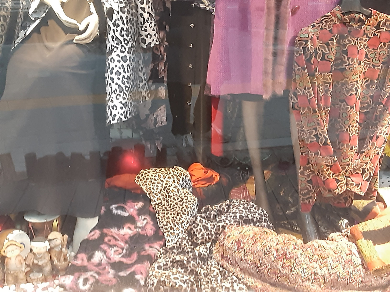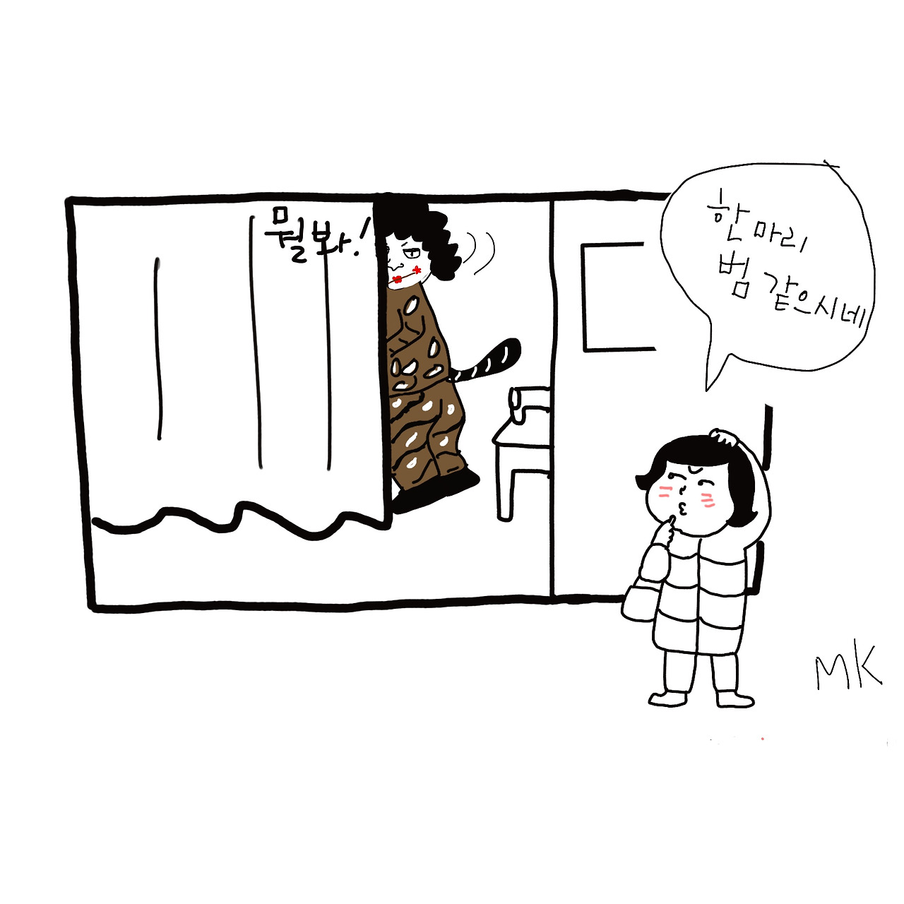 길거리 걷다가 시선을 끄는 호피무늬 옷을 만드는 양장점 앞에 섰다.