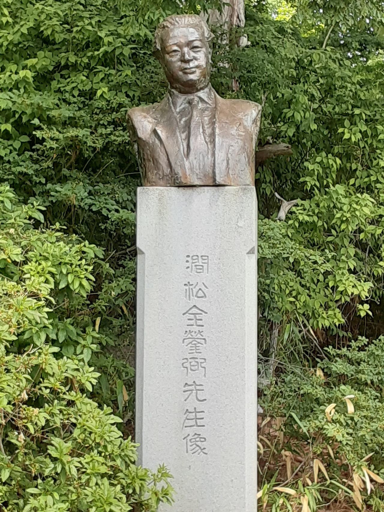 정문에서 바라보니 고양이 두 마리의 석상이 보이고 옆에 약간 비틀게 위트 있는 간송의 석상이 보인다.