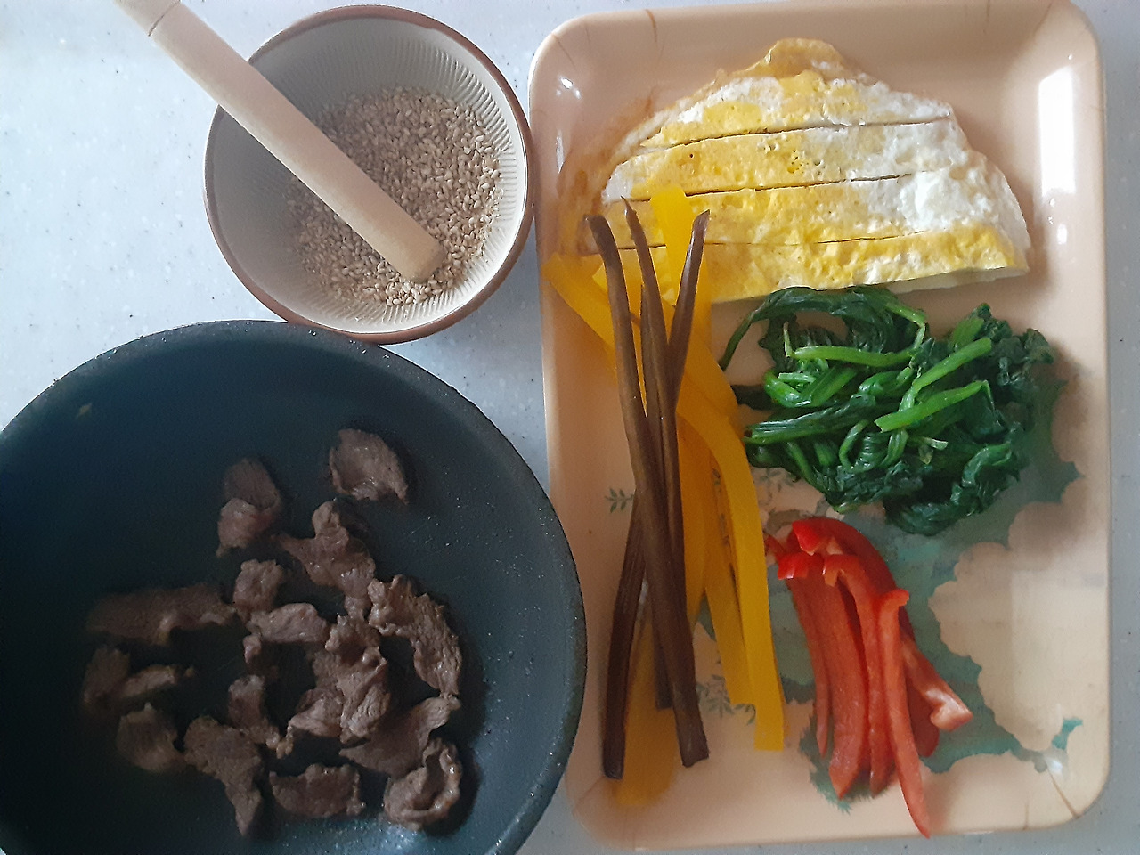 당근색을 대신할 게 없나 찾아보니 파프리카가 야채실에 있었다. 당근 대신 파프리카를 넣어서 먹었더니 유난히 단맛이 도는 게 나에게는 달달하면서 상큼한 맛이었다.