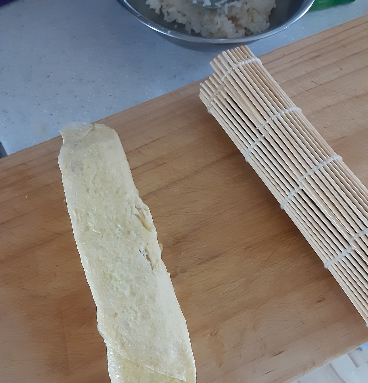 약간 식힌 밥을 얇게 펴서 식힌 계란을 넣어서 김발에 만다.