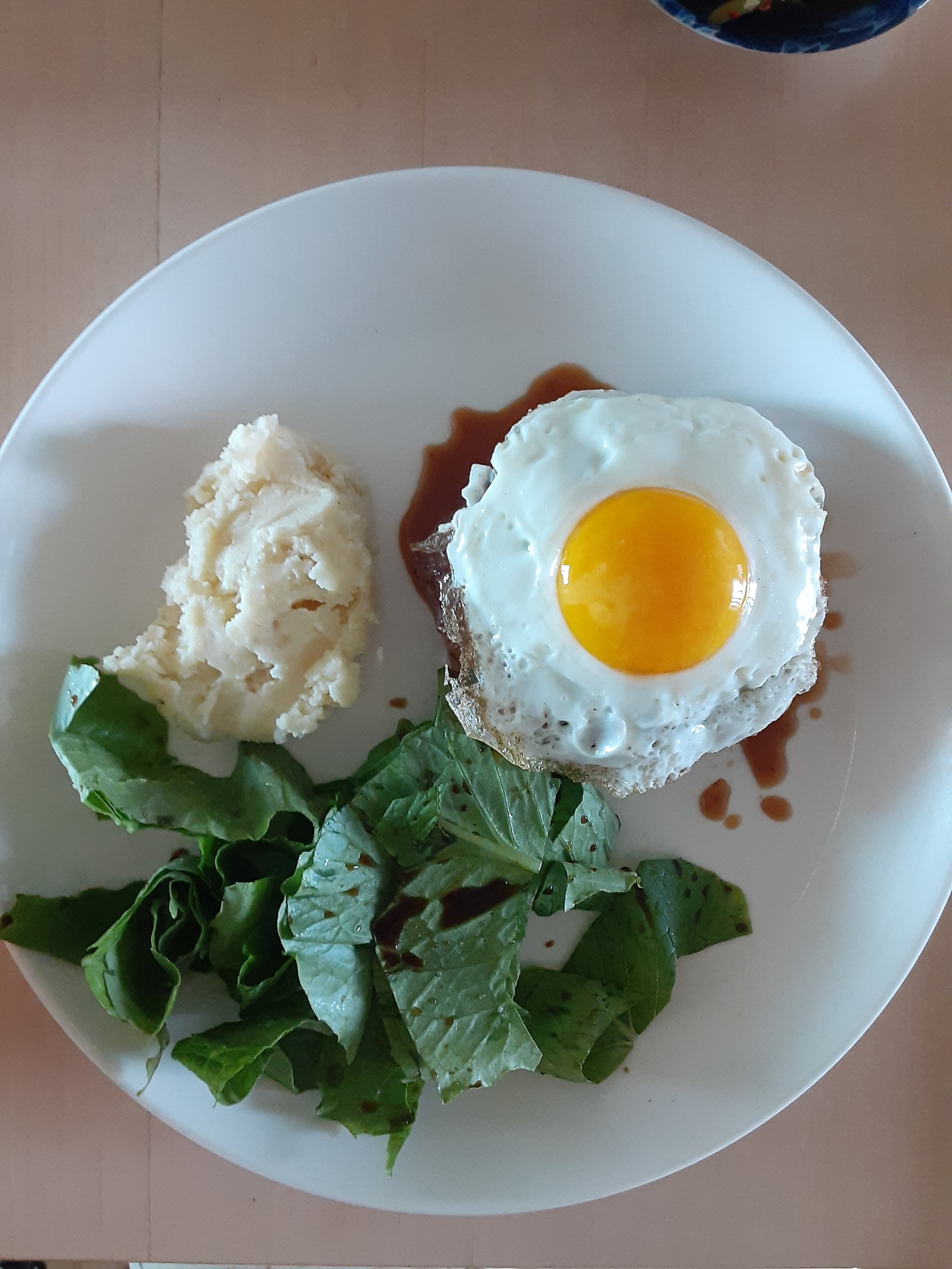 함박스테이크는 계란 노른자를 터뜨려 썰고 마요네즈 소스의 으깬 감자 샐러드와 먹는 것이 매력적이다